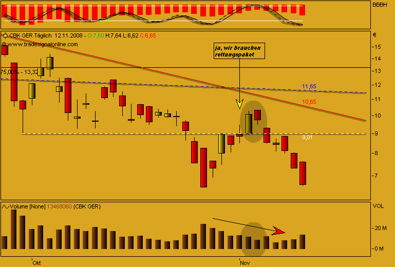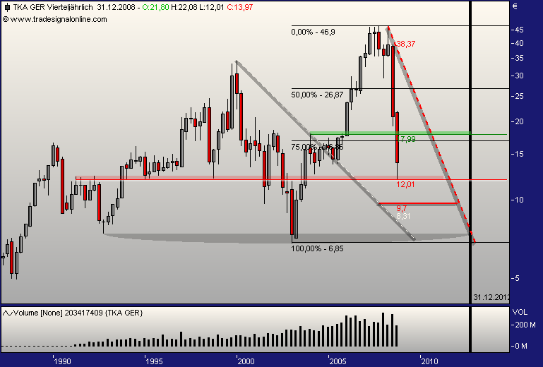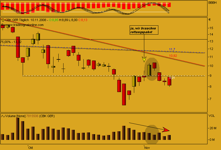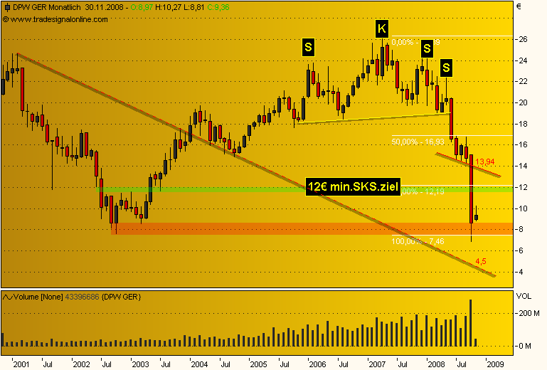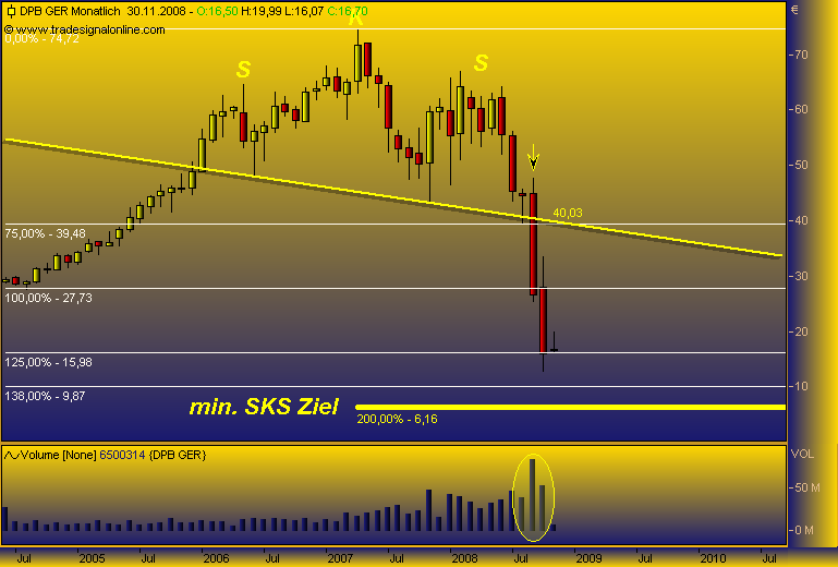 hallo, bin wirklich sehr neu hier und auch im aktiengeschäft. habe folgende aktien im depot! Comerzbank --- einstieg bei 10,40 Deutsche Postbank --- einstieg bei 19,62 Freenet --- einstieg bei 5,65 Infenion --- einstieg bei 3,09 Porsche --- einstieg bei 67,54 Q-cells --- einstieg bei 33,73 siemens --- einstieg bei 52,85 nun weiß ich, dass ich bei einigen werten die bodenbildung nicht abwarten konnte, da ja wirklich neu im geschäft.... sollte ich die werte so lange im depot lassen, bis sie wieder im plus sind oder doche eher von einigen trennen!? ich wäre frohm wenn ich professionelle antworten bekommen könnte... die charts von toni.macaroni sind interessant, aber für mich als leihen meistens nicht durchschaubar.... sieht aber sehr professionel aus.. was ich daraus lesen kann ist, dass einige werte für die aktien die ich habe noch weiter runter gehen könnten.. wenn dem so ist, würde ich natürlich früh genug aussteigen.... wobei ich dazusagen möchte, dass ich ein langzeitanlegercharakte bin.. also nicht immer af schnelle gewinne aus bin... danke im voraus.. gruß escobaro |