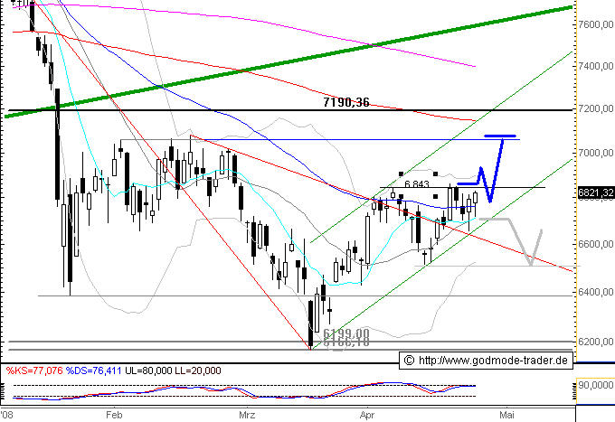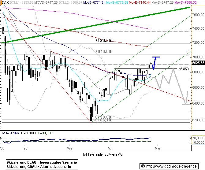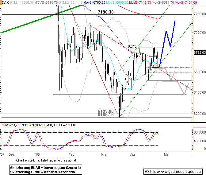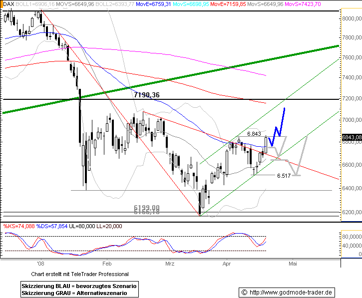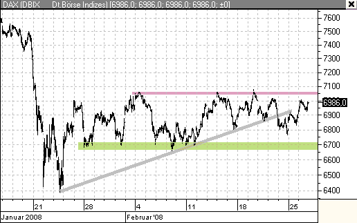 DAX-CHARTANALYSE Auf dem Weg zum Ausbruch ------------------------------------------------ Quelle: Investox und Börse-Online ------------------------------------------------ Wie schon am Montag überwog auch gestern wieder die Nachfrage nach den Werten des Deutsche Aktienindex das Angebot. Als Konsequenz näherte sich der Index wieder der Obergrenze der aktuell gültigen Tradingrange. ------------------------------------------------- Bereits zwei Tage nach dem Fall unter die kurzfristige Aufwärtstrendlinie (grau) hat sich der Index wieder auf sein damaliges Ausgangsniveau erholt. Die Trendgerade ist zwar nach wie vor durchbrochen und damit für zukünftige Analysen so gut wie wertlos. Allerdings sind die ausbleibenden Anschlussverkäufe ein gutes Zeichen.