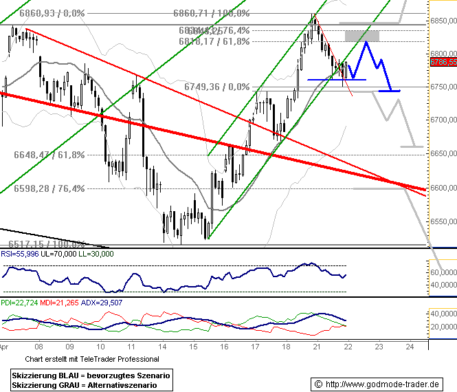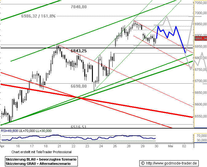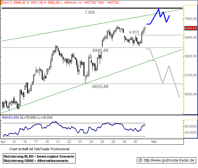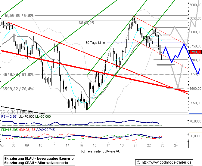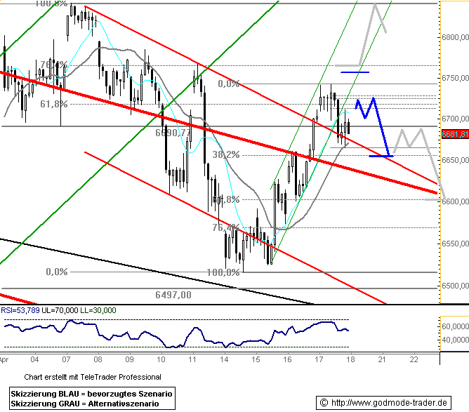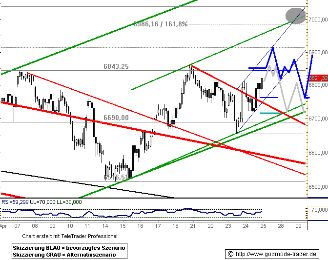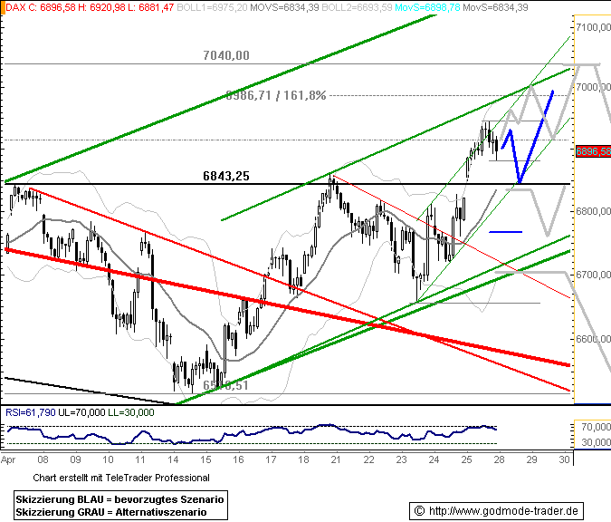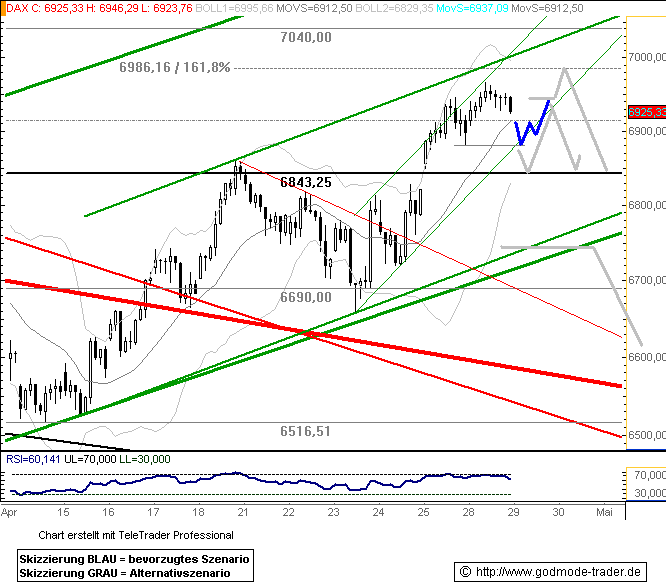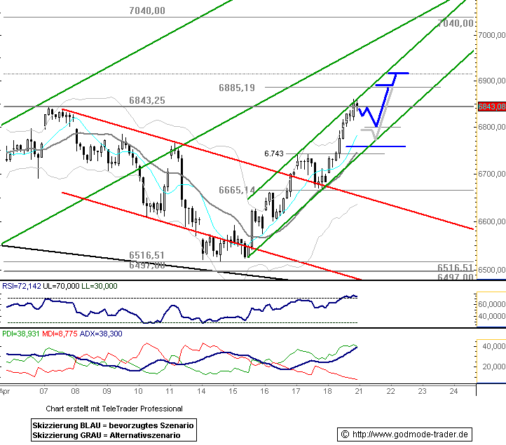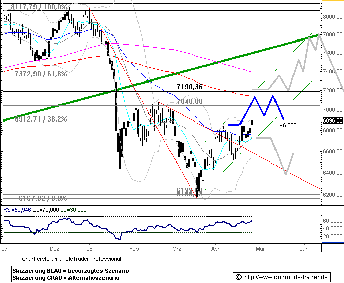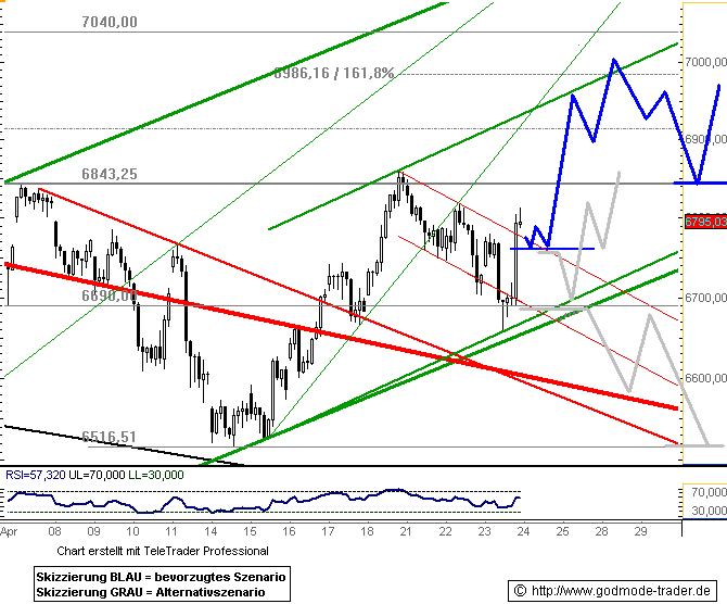 Dass sich der DAX im Gegenteil sogar zurück an die 7000er-Marke erholt hat, lässt auf einen baldigen Test der Widerstandszone bei 7060 Punkten (rot) hoffen. Kommt es zu einem erneuten Schwächeanfall, hilft die frisch bei 6920 Punkten ausgebildete Unterstützung. |