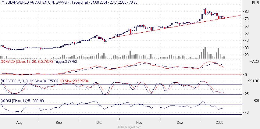 Über die SolarWorld AG: Der Konzern der SolarWorld AG ist das weltweit einzige vollintegrierte Solarstromunternehmen, das sich ausschließlich der Solarenergie widmet. Entsprechend ist es auch an der Börse - wo es seit 2003 im Prime Standard und seit Juni 2004 im Nemax50 gelistet ist - ein Unternehmen mit ausgeprägter Alleinstellung. Nach dem Börsengang Ende 1999 hat sich die SolarWorld AG innerhalb weniger Jahre von einem solaren Handelshaus zu einem integrierten solaren Technologiekonzern entwickelt und dabei seine Mitarbeiterzahl von ursprünglich 12 auf 559 Menschen zum Ende des ersten Halbjahres 2004 verstärkt. Der SolarWorld-Konzern ist auf allen Wertschöpfungsstufen der Solarindustrie - vom Rohstoff Silizium bis zur fertigen Solarstromanlage - aktiv. In Freiberg unterhält der Konzern eine integrierte Solarfabrik, in der aus Siliziumrohstoffen über die Herstellung von Wafern und Zellen schließlich Solarstrommodule gefertigt werden.