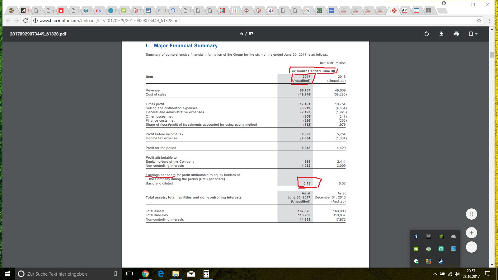 Der Rest sind "non controlling interests". Das heißt die 986 sind maßgebend, weshalb auch nur 0.13 RMB/share erzielt wurden im ersten Halbjahr (wie im HJ-Bericht ausgewiesen, siehe mein Screenshot von oben). Selbst wenn das zweite HJ absolut super werden sollte, sehe ich für eine BAIC-Aktie eine faire Bewertung bei ungefähr zwischen 0,7-0,8.