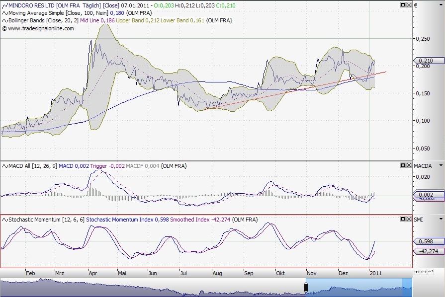 Der Chart sagt, es sind verschiedene Hürden überwunden, wie die Hunderttagelinie oder es steht kurz bevor, wie das durchbrechen des oberen Endes des fallenden Bollingerbandes nach oben, was ein starkes Kaufsignal generiert. Der mittelfristige Aufwärtstrend hat sich bestätigt. Der letzte Anstieg ist zwar steil aber in mehrere Phasen aufgeteilt, damit ist der Kurs nach unten mit kleinen Unterstützungen abgesichert, bis er bei 0,175 an starker Unterstützung aufgehalten würde.
