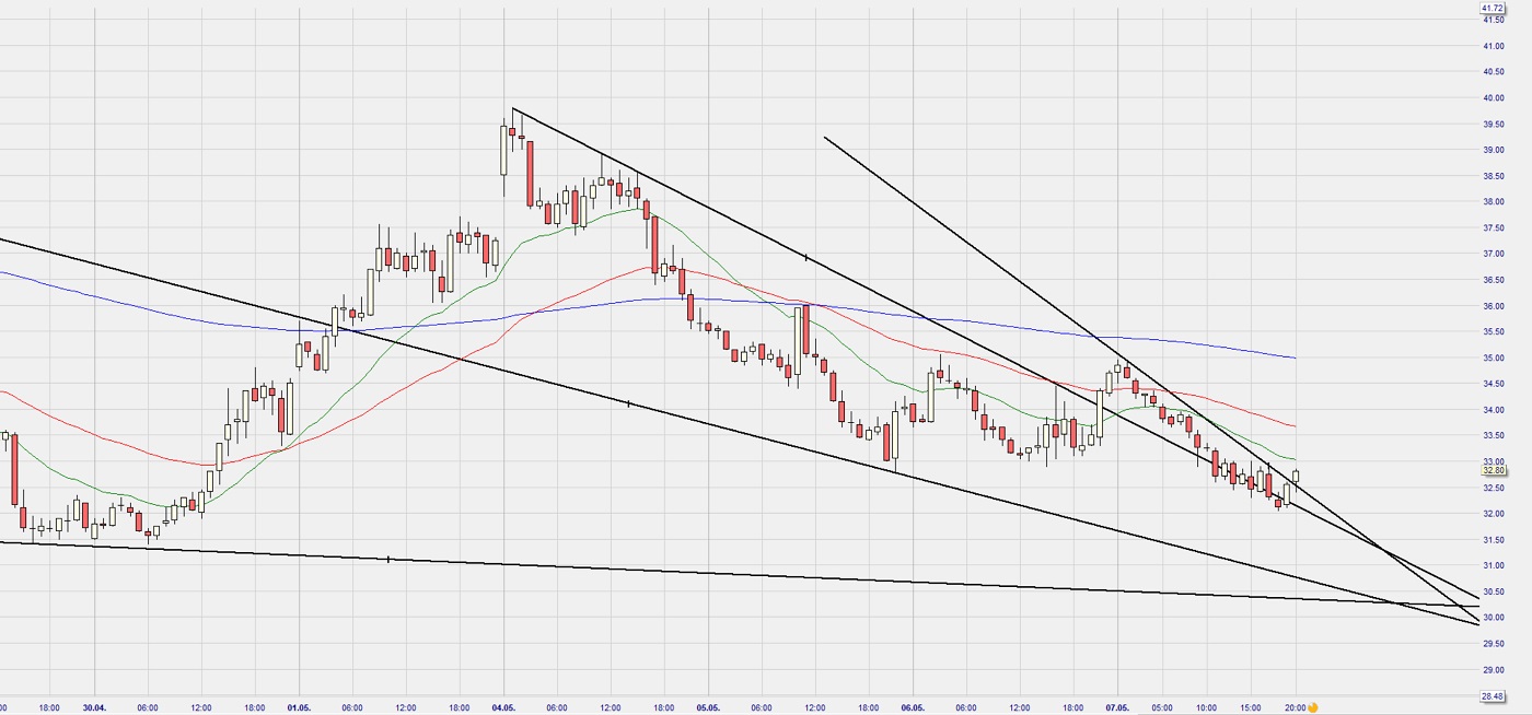 Meinen Short möchte ich halten bis wir aus dem Kanal raus sind und den Unterstützungsbereich 200-350 erreichen. Die paar Punkte jetzt da oben hin und her ist mir egal, ich habe mir heute ne längere Tradingpause gegönnt, habe einige Fehltrades gemacht im Vormittag. Wichtig wäre nur, das wir nicht aus dem Kanal oben ausbrechen.