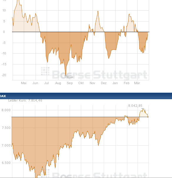 Der Euwax nähert sich wie unter dem Nachrichteneinfluss erwartet langsam der Short-Zone. Idealerweise dürfte er im Laufe der nächsten Woche über Null gehen und um die Nullinie pendeln. Parallel steigt der Dax wieder leicht und läuft ein paar Wochen seitwärts(um die Jungbären abzuschütteln und die Altbären bei der Stange zu halten, wie melbacher sicher schreiben wird).