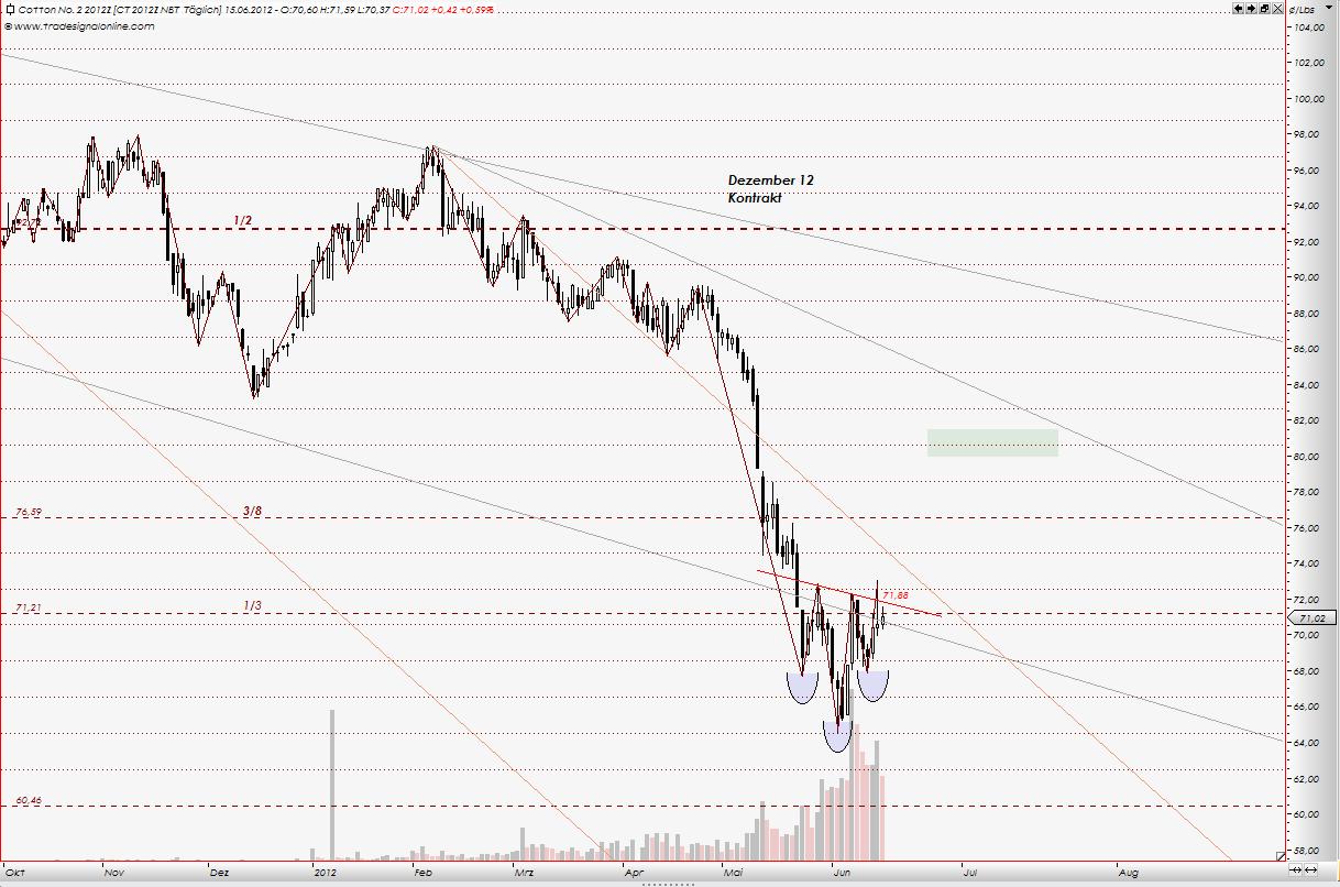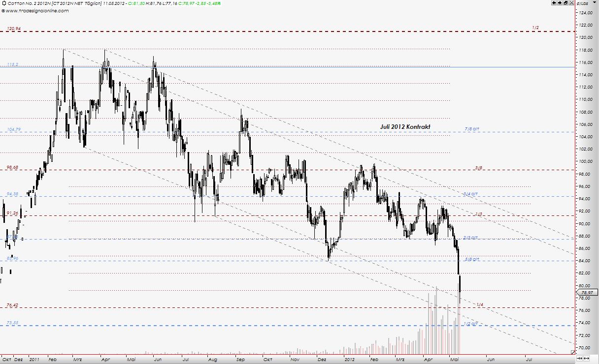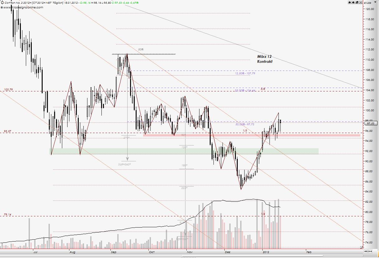 sind nicht ausgeschloßen.... im Dezember 2012 Kontrakt. Für aktuellen Kontrakt, Juli 2012, was ja dem Endloskontrakt zugrundeliegt, bedeutet das 74 us cent. Im Bereich zw. 74 und 76 liegen Unterstützungen für Juli 2012 Kontrakt, im Form der Gann Linien. Vor allem 73,55 - dort die 1/2 Gann Linie, berechnet aus der alten Handelsspanne zw. dem Hoch vom 1995 und dem Tief 2001 aller Juli Kontrakten. 66... und tiefer ... werden auch kommen, jedoch später. Bärenmarkt bei Baumwolle soll noch bis Herbst 2012 gehen. ----------- "Hoffnung, Angst und Gier lassen sich nicht mit einer Erfolgreichen Trading-Strategie vereinbaren" W.D. Gann |