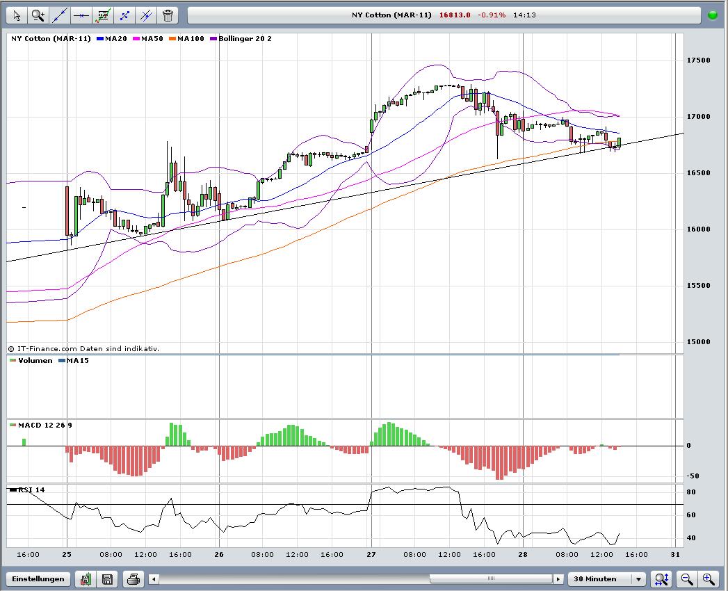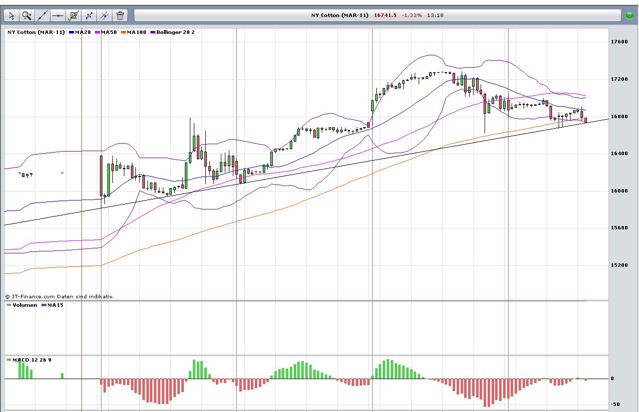 Also bei CFD´s würd ich mir vorher anschauen welchen Spread oder mit welcher Kommastelle die Anbieter rechnen. Beispielsweise bei einem Anbieter wie CMC Markets. 1 CFD (Kontrakt) Baumwolle = 16472,5 U$-Dollar Das heisst, hier hast du wegen der geringen Margin, die du hinterlegst (3% vom Gesamtwert) ein Verhältnis von 1 / 10000. Das heisst hier handelt man nicht mit dem realen Wert von 1,64725 U$-Doller sondern gleich mal mit dem 10.000 fachen. Kann sich ja jeder selber ausrechnen wieviel Gewinn/Verlust das bei einem Tag mit 5% Schwankung das sind. Die Aktuellen COT-Daten für Baumwolle sind: Commercials Netto Pos.: -43.105 (Änderung Vorwoche: -3.833) Large Speculators Netto Pos.: 31.552 (Änderung Vorwoche: +3.069) Small Speculators Netto Pos.: 11.553 (Änderung Vorwoche: +764) Weiss jemand wo man die Daten der Vorvorwochen anschauen kann um sich mal ein Bild zu machen, wieviel Einfluss die Zahlen auf die Bewegungen des realen Preises zu sagen haben? Also eigentlich die COT-Daten des letzten Jahres oder so. (Vielleicht findet sich hier ein fleissiger Sammler?) Grüsse $unny P.S. Was haltet ihr von der Nachricht, das die Chinesen Baumwolle horten, weil sie nun noch gieriger geworden sind? |