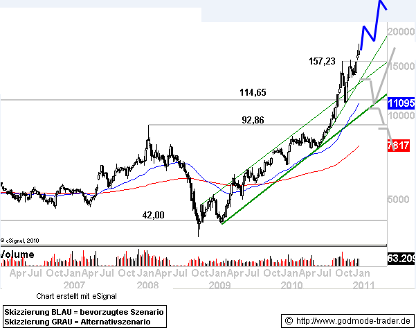 Rückblick: Der Future auf Baumwolle befindet sich seit November 2008 in einer Rallybewegung, welche sich seit Mitte 2010 nochmals deutlich beschleunigt. In einer extrem steilen Rally wurden das 2008er Hoch bei 91,38 sowie das Hoch aus 1995 bei 114,65 US-Cent direkt überwunden.