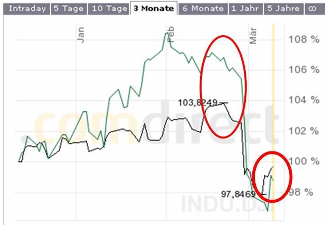 Grund ist, dass alle Bären, die geduldig auf das "große charttechnische Einstiegssignal" gewartet hatten, nach dem Einbruch vom 27. Februar short gegangen sind. Durch das Shorten beschleunigten sie die Abwärtsbewegung. Irgendwann aber kommt der Punkt, wo niemand mehr verkauft, weil alle schwachen Halter rausgeekelt sind. Nun steigen die Börsen langsam wieder (seit letzten Dienstag), und die Bären fallen Indexpunkt für Indexpunkt, den die Indizes nach oben kriechen, wieder um.