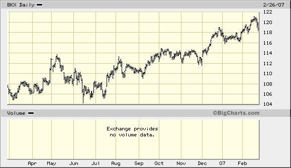 In my column on Friday, I talked about some areas of strength that were popping up in the market. On the flip side, while doing my research this past weekend, I noticed a few areas of weakness that are of some concern. It is not yet clear if the weakness is from institutions rotating funds into new areas, or if it is the product of some internal deterioration going on in the market. The two areas that concern me the most are the brokerage stocks and the financials. When these areas begin to fail, it is often an early warning signal that the general market could get into trouble down the road. There were fairly large 1%-2% heavy-volume selloffs in many of the stocks in these two sectors. If current support levels are broken, it will probably develop into an intermediate-term downtrend for these indices and the stocks. OK, let's take a look at the charts. You can see that the Broker-Dealer Index has been consolidating for over a month. On Friday, it dropped almost 2% on heavy volume. It is now sitting right on its 50-day moving average support. A break below $247 could lead to an intermediate-term correction to the $230 area. Many of the stocks that make up this index already have broken their 50-day moving averages and key support areas. You may want to review my column on Feb. 14 where I talk about the brokerage area and some downside target areas if the support levels were broken.