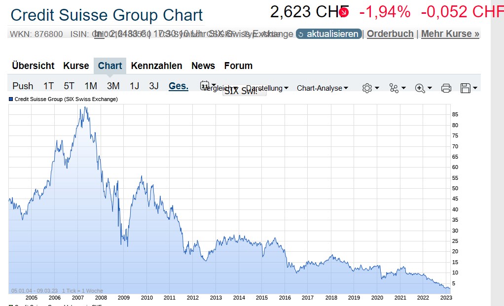 Die Aktie der Credit Suisse erreicht am Dienstag mit 2,59 Franken ein neues Allzeittief, nachdem die Nachrichtenagentur Reuters gestützt auf zwei Quellen berichtet hat, dass die Finanzmarktaufsicht Fin.ma Aussagen von CS-Präsident Axel Leh.mann genauer unter die Lu.pe nehme, die er Anfang Dezember gegenüber einer Reihe von Medien gemacht hatte.