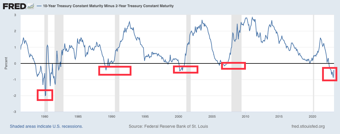 Unten im Chart sieht man genau dies: Die Renditen der 2-jährigen (orange) sind mit 4,5 % höher sind als die die 10-jährigen (blau) (3,7 %). Damit ist die Zinskurve invertiert, was als Vorzeichen einer Rezession gilt: