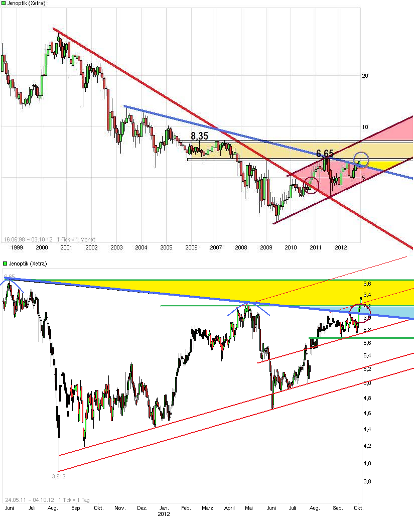 Das bisherige 2012 Jahreshoch vom April wurde ja gestern übertroffen und auch die blaue Abw.trendlinie überwunden. Das ist schonmal kein schlechtes Zeichen. Also wenn man es jetzt im zweiten Anlauf schaffen würde die 6,65 zu überwinden, dann wäre nach oben Luft bis zum nächsten größeren horizontalen Widerstand bei ca. 8,35. Also mal schauen, ob es "große Hände" gibt, die kräftig genug schieben Richtung 6,65 + x im letzten Jahresdrittel..