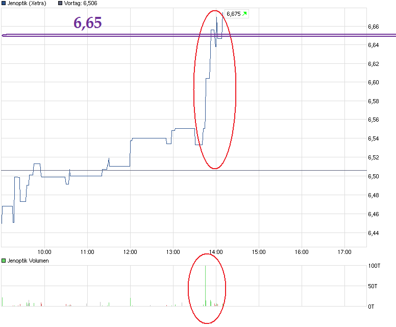 .... durch einen schlagartigen Anstieg darüber. Ist die Frage warum so plötzlich? Hat irgendeiner der Börsenpusher Marke Förtsch&Co. etwas breitenwirksam rausposaunt kurz vor 14:00 oder woher kam das plötzlich erhöhte Volumen mit dem 6,65 Breaker her? Oder wollte da ein instit. Investor einfach den dünnen Handel heute nutzen, um mit so fix mit einer großen Order die 6,65 zu knacken und damit dann ein Kaufsignal zu generieren was seinen Bestand wertvoller macht, wenn genug Leute auf dieses Signal hin den Kurs weiter hochkaufen?  Wie dem auch sein, man soll den Tag nicht vor dem Abend loben. Erstmal wollen die 6,65 jetzt auch auf SK verteidigt werden. Wenn das die kommende Zeit gelingen sollte, dann könnte die horizontale Widerstandsmarke 6,65 mutieren zu einer künftigen horizontalen Unterstützungsmarke und der Bereich 7,xx hoffentlich in der Fokus rücken. Wird aber letztendlich darauf ankommen was die Q.3 Zahlen und Prognosen bringen und wie der Markt das aufnimmt. ....