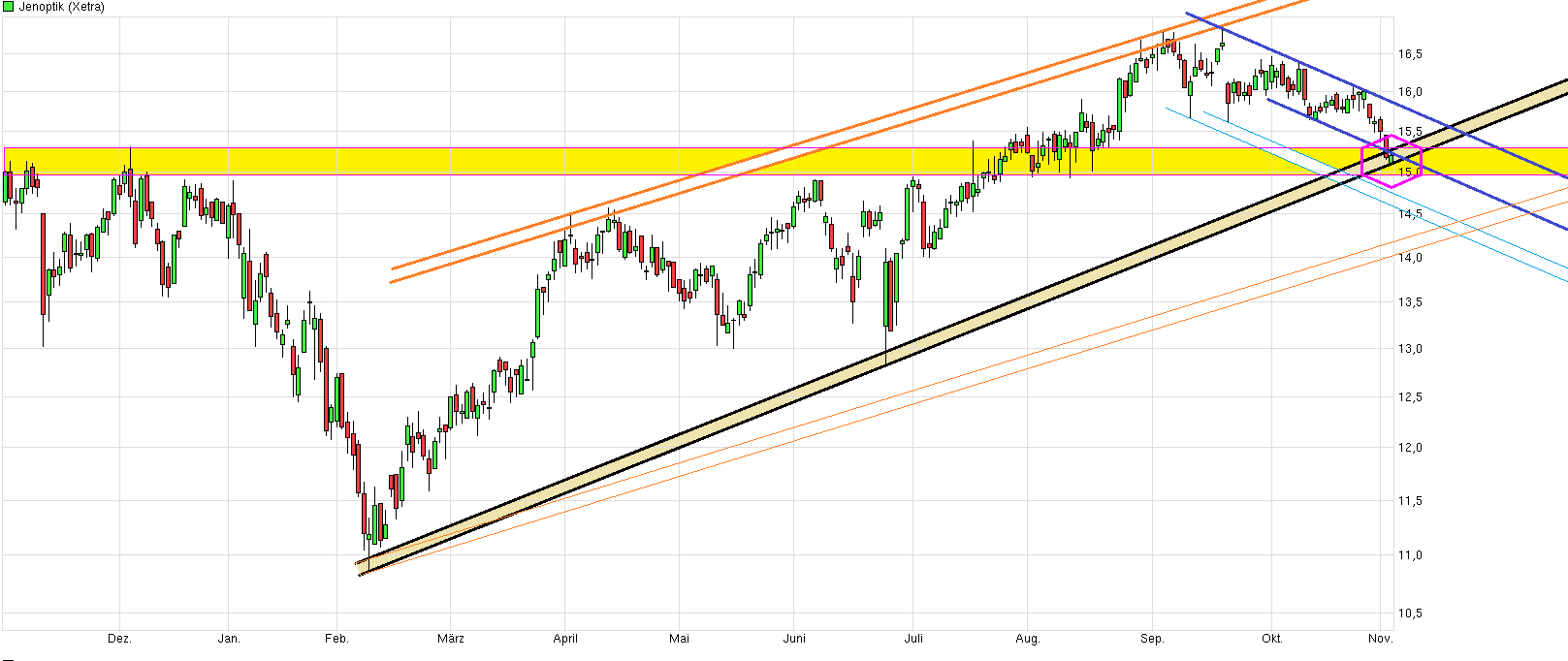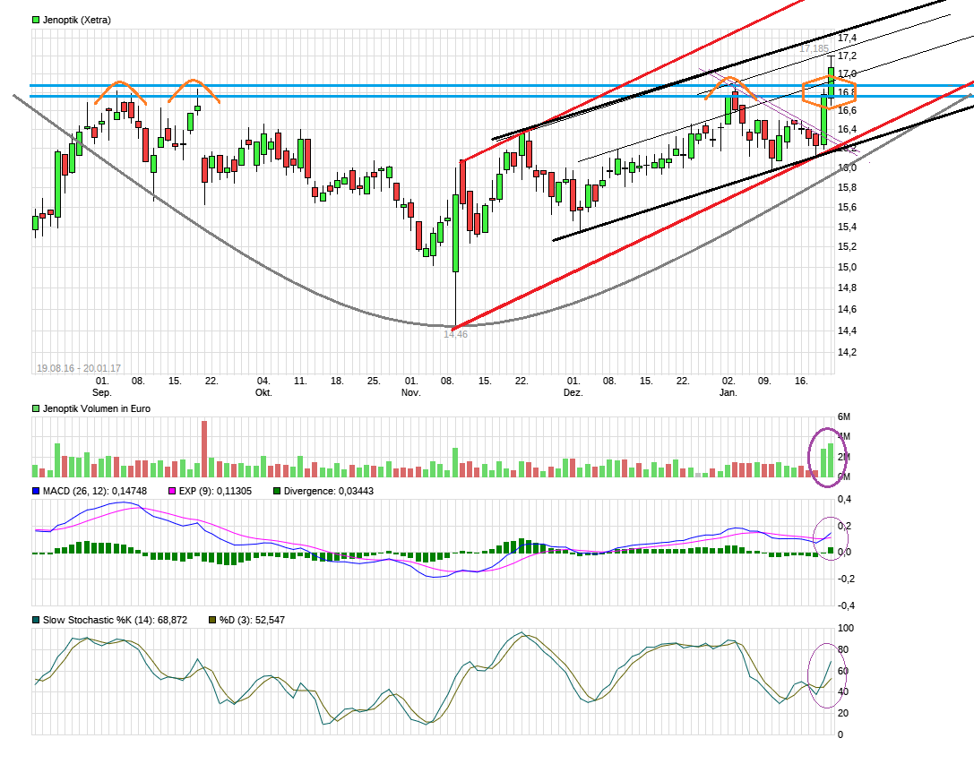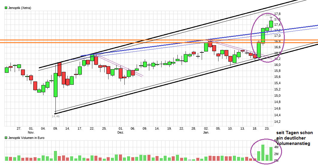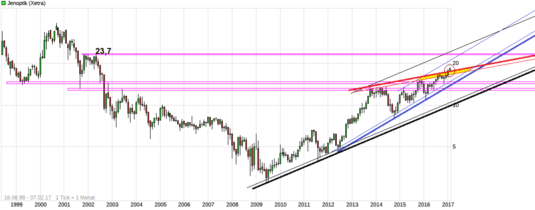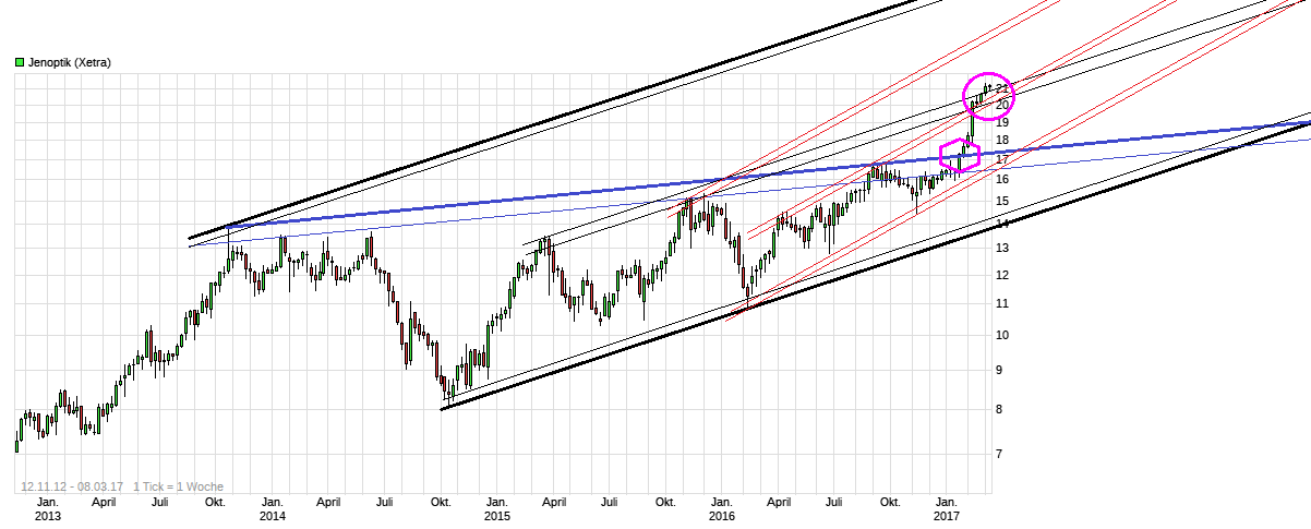 " ......... Die Aufwärtsbewegung seit 2009 konnte lange in einem Trendkanal eingrenzt werden. An dessen Oberkante kletterte die Aktie im April 2017. Es deutete sich sogar ein Abpraller an dieser Widerstandslinie ab. Aber seit letzter Woche zieht die Aktie über diese obere Begrenzung raus. Diese Trendlinie verläuft aktuell bei 24,67 EUR. Damit bildet Jenoptik aktuell eine lange weiße Kerze aus, die komplett oberhalb des alten Trendkanals liegt.