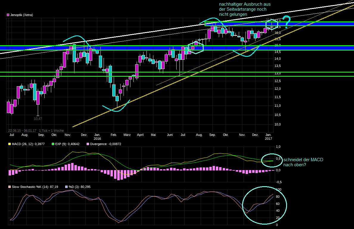 Ausblick. Besonders in der jüngeren Zeit scheint das Geschäft deutlich wieder anzuziehen. Und die Margensteigerung ist dabei auch nicht ungünstig ;) Kurs reagiert heute sehr positiv in einem ansonsten eher unmotivierten Gesamtmarktumfeld. Ob da ein "Vögelein" vor kurzem schon etwas vorher jemandem geflüstert hatte? Denn da wurde ja unter sehr auffällig hohem Volumen schon vor den Zahlen in den Vorwochen gekauft. Da muß sich jemand Größeres also schon sehr sicher gewesen sein, daß die Zahlen und die Reaktionen darauf kursförderlich sein werden. Wie dem auch sei, der Kursverlauf kommt allen zugute die investiert sind. Von daher aktuell eher wenig Grund zum klagen. Man könnte höchstens sagen, daß durch den größeren Anstieg vor den heutigen Zahlen einiges vieleicht auch schon vorauseilend eingepreist wurde. Muß man also mal abwarten wie weit die direkte Freude über die Zahlen jetzt kurzfristig noch trägt und was noch nicht hinreichend bereits eingepreist ist. Muß ja auch nicht schrurgerade nach oben laufen. Etwas Atempausen zwischendurch und möglichst rund um künftige Q.Zahlen immer wieder einen kleinen weiteren Schritt nach oben wäre auch keine schlechte Variante. Nach unten sollte die potenzielle Fallhöhe mit dieser festen fundamentalen Basis eher überschaubar bleiben solange nicht parallel der Gesamtmarkt wieder in eine größere Delle läuft. Wunsch wäre es in einem möglichst noch eine Weile guten Gesamtbörsenumfeld sich dann in absehbarer Zeit auch mal Kursen wieder zu widmen mit einer zweistelligen Zahl vor dem Komma die mit einer Zwei anfängt ;) Muß jetzt nicht innerhalb weniger Wochen oder Monate passieren, aber mittelfristig mit Blick auf z.B. 2018 durchaus nicht unvorstellbar, wenn der momentane Schwung den Jenoptik im operativen Geschäft/Auftragseingang hat weiter anhalten sollte Jenoptik bekommt Rückenwind von guter Auftragslage Dienstag, 07.02.2017bhttp://www.ariva.de/news/...ueckenwind-von-guter-auftragslage-6030434 "..Jenoptik hat 2016 mit neuen Bestmarken abgeschlossen. Vor allem gegen Ende des Jahres habe das Geschäft noch einmal an Dynamik gewonnen. Der Umsatz legte um 2,5 Prozent auf rund 685 Millionen Euro zu. Das operative Ergebnis (Ebit) stieg auch mit Hilfe von Kosteneinsparungen um rund 12 Prozent auf über 68 Millionen Euro. Dies war mehr als Analysten erwartet hatten und auch mehr als Jenoptik zuletzt in Aussicht gestellt hatte.... Der Auftragseingang verbesserte sich um etwa 15 Prozent auf mehr als 730 Millionen Euro. Dies sowie Kontrakte über 160 Millionen Euro stimmen Jenoptik zuversichtlich für das laufende Jahr. Umsatz und Ergebnis sollen weiter steigen. .... Jenoptik ist zudem seit Ende 2016 schuldenfrei.