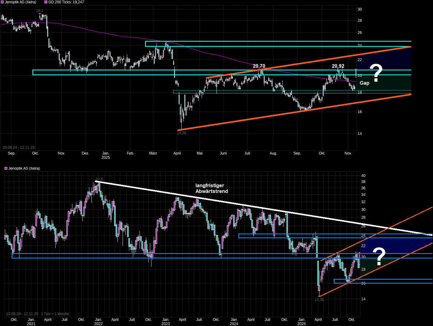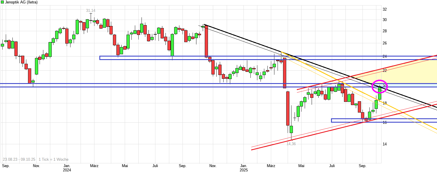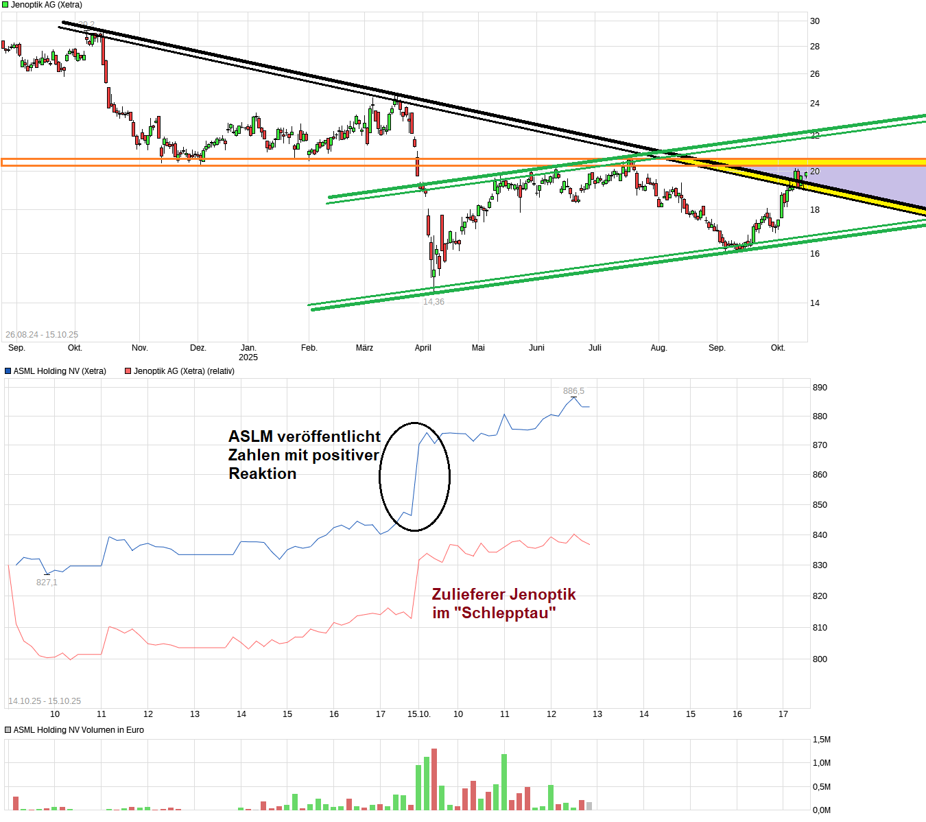 Tja, man hatte ja jüngst dann doch leider bei Jenoptik gesehen wie unwillig die Käufer wurden als es in die harte Widerstandsregion um 20,40/70 ging. Auch im Anschluß an die Bekanntgabe der unvorteilhaften Zollregelung für die EU mit 15%Zoll gab man nach. Es gab parallel zudem immer wieder Zahlenverfehlungen und Prognoserevisionen von anderen Zulieferer-Firmen der Chipindustrie wie auch von einigen Chip-Firmen selber ( z.B. ASML). Von daher dürfte der Zweifel da wieder angestiegen sein, ob Jenoptik die im Frühjahr nach den Q.1 Zahlen nochmal bestätigte Jahresziele doch noch erreichen kann. ( =>13. Mai 2025, AKTIE IM FOKUS: Schwache Profitabilität belastet Jenoptik - https://www.ariva.de/aktien/jenoptik-ag-aktie/...et-jenoptik-11632963 ".... Eine unerwartet schwache Profitabilität des Technologieunternehmens Jenoptik zum Jahresauftakt hat den Aktienkurs unter Druck gesetzt .... Vor allem wegen der Schwäche im Segment Halbleiterausrüstung ging der operative Gewinn im ersten Quartal um 18,6 Prozent zurück... Damit hätten die Jenaer die Konsensschätzung um 11 Prozent verfehlt.... Das Unternehmen habe zwar die Jahresziele bestätigt, diese seien mittlerweile aber mit Risiken behaftet... Ursache seien vor allem die im Raum stehenden Importzölle und deren wirtschaftliche Auswirkungen...")
