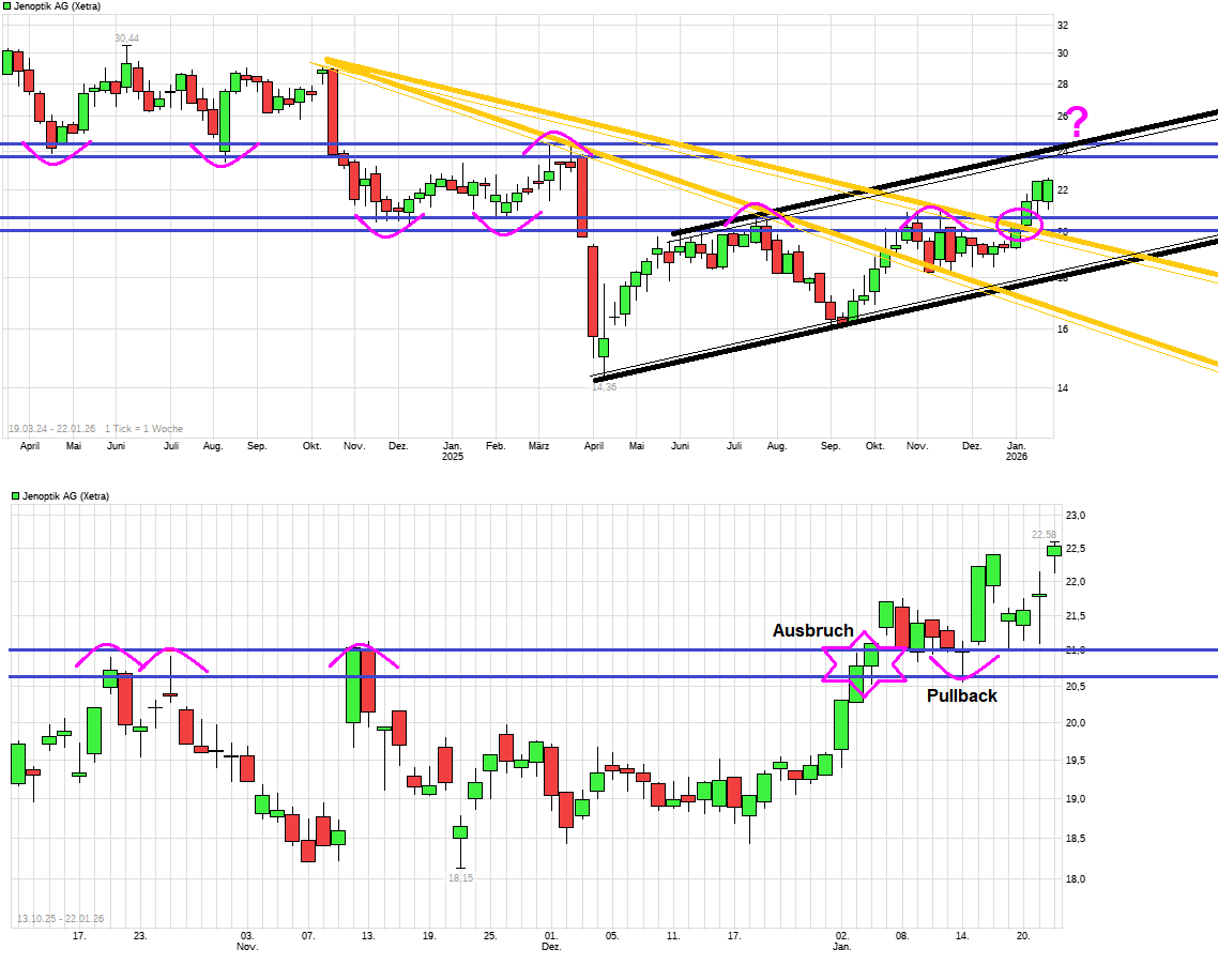 So langsam sollte man sich im AR entscheiden ( und auch verkünden) wer als CEO der Nachfolger von Stefan Traeger wird. Denn am 15. Februar wird Traeger die Firma bekanntlich verlassen und es wäre daher gut für die Aktionäre rechtzeitig zu erfahren welche Person mit welchem Werdegang hier dann das Amt übernimmt. Aktuell profitiert man heute bei Jenoptik indirekt von guten Branchennews im Chip-Bereich. ( =>15. Januar 2026, AKTIEN IM FOKUS: Chipwerte gefragt nach TSMC-Ausblick - ASML auf Rekord https://www.ariva.de/aktien/infineon-ag-aktie/...sblick-asml-11873857 ). Gestern hatte man einen Pullback gemacht an die jüngst überwundene alte Widerstandszone von ca. 20,50/21,00€ . Von daher gut, daß es heute dann fix die Gegenreaktion nach oben wieder gibt.