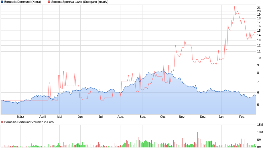 Bevor jetzt gleich nba1232 einen Anfall bekommt sei noch gesagt, daß die BVB Aktie jetzt bei 14,50 stehen müsste, hätte sie in den letzten 12 Monaten genauso gut performt wie Lazio. Diese bessere Performance wird sich sehr wahrscheinlich fortsetzen, falls Lazio die CL erreichen sollte, wird Lazio in den nächsten 12 Monaten mindestens doppelt so gut performen wie die BVB Aktie.