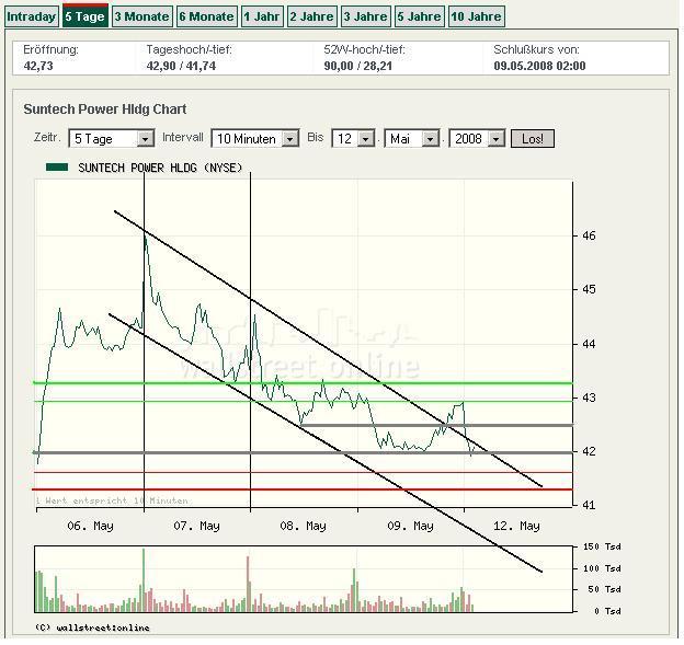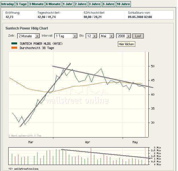 | In den nächsten zwei bis drei Tagen werden wir schlauer sein. Ich vermute, dass es sich bei der derzeitigen Chartformation der letzten Wochen um einen Keil handelt. Dafür müsste es aber bald zum Ausbruch kommen, sonst wird aus dem Keil eben doch ein waschechter Abwärtstrend. Gut ist auf jeden Fall aber schonmal, dass es bei weitem nicht so steil runter- wie es vorher seit Mitte März rauf ging. Das ist zunächst ein gutes Zeichen. Ebenfalls gut ist, dass das Volumen in dieser Zeit eher abgenommen hat. Entscheidend wird sein, ob wir heute und morgen über der Unterstützung bei 42 schließen (grauer Balken), ob wir es über den Widerstand bei 42,50 schaffen (kurzer grauer Balken) oder ob der Kurs eine ähnliche Abwärtsdynamik hinlegt wie in den letzten Tagen ODER ob er diese sogar verstärkt. Die "Untertasse" von Freitag war schonmal ein ganz gutes Zeichen, jetzt müssen wir eben schauen, was morgen und übermorgen passiert! |