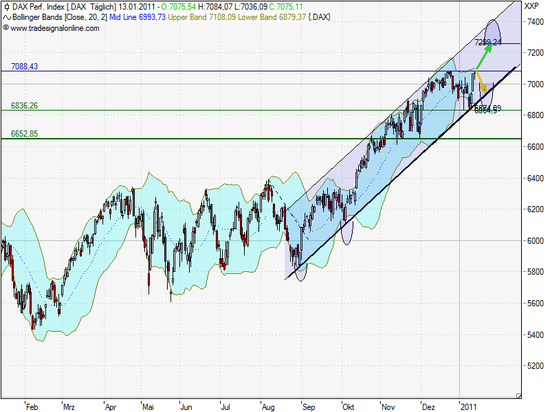 Schön, wie heute die DB erneut gegen den Dax outperformed :):)! Aber wie wird es nun weiter gehen? Es wird wohl am Gesamtmarkt abhängig sein, in welche Richtung es gehen wird. Beim DOW sieht es eig. ganz klar nach einer Korrektur aus (->charttechnisch zumindest) Beim Dax sieht es zweigeteilt aus. Die Chancen stehen 50/50. Ich vermute allerdings, dass es morgen erstmal wieder runter geht mit dem Dax- der wiederum wird auch die Deutsche Bank mit runter ziehen! Dax konnte heute wieder die Marke von 7088 Punkten nicht übersteigen. (Mein Bauchgefühl sagt mir, dass es morgen runter gehen wird (<-1%), aber nur meine Meinung :)) Hab mal noch ein Chartbildchen vom Dax, allerdings ohne Indikatoren, da man sonst den Chart an sich kaum mehr erkennt, wenn unter dem Chart noch 5 Indikatoren angeklammert sind ;) Aber kurz was zum MACD: Er steht kurz vor einem Kaufsignal :), der RSI hat noch Luft nach oben :), auch die Bollingerbänder geben noch weiteren Spielraum nach oben, einzigst negativ ist das On Balance Volumen, welchen dem Kursverlau etwas hinterher hinkt! |