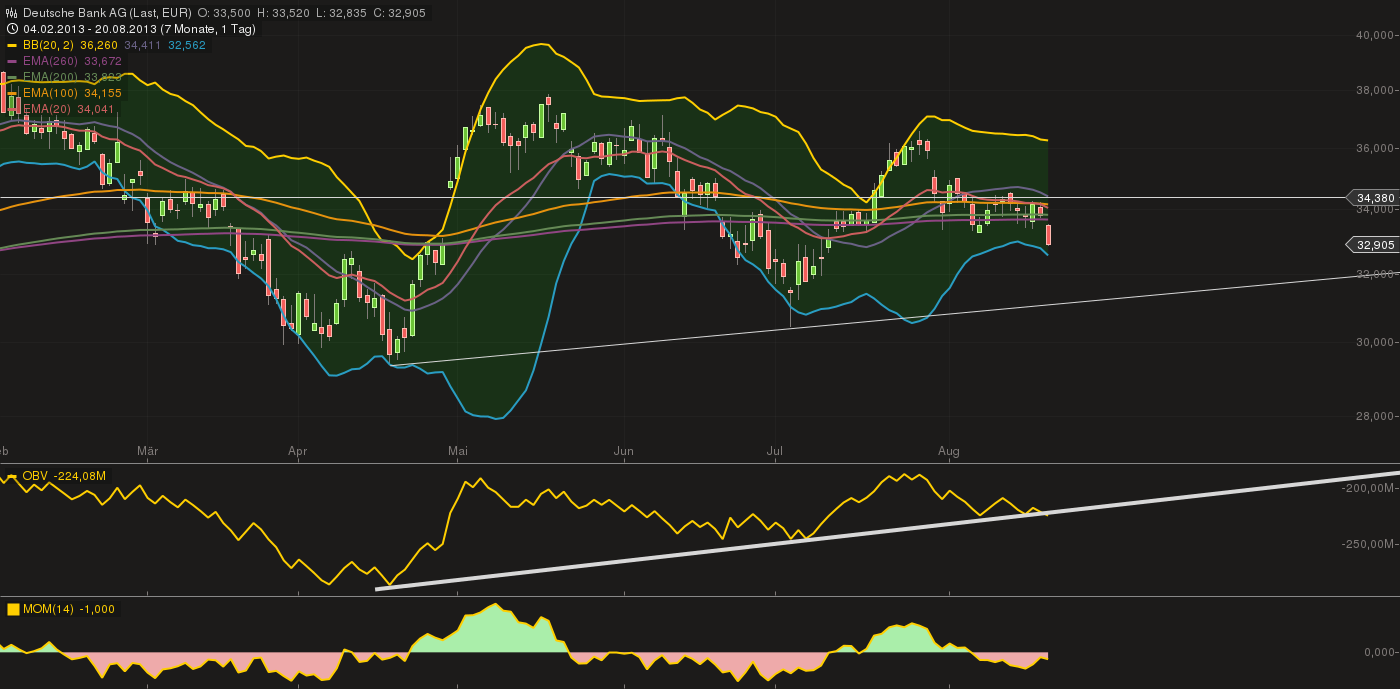 Also...ich möchte doch hier eine Warnung ausrufen....Der Kurs ist unter die EMA260 gerutscht....das ist sehr schlecht...Wenn die Unterstützungslinie beim OBV Signal nicht hält, gibt es eine Rutsche unter die 32.....Dass der Kurs so vor sich hindümpelt....runter auf 32...rauf 35...das kenne ich aus eigener Erfahrung bei anderen Aktien....ist eine Schwäche...und dann kann es Ruuums nach unten machen....sorry für den Pessimismus...