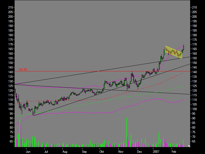 Aus rein fundamentalen Gesichtspunkten ist das Papier mit einem 2008er-KGV von 21 allerdings bereits mehr als ausreichend bewertet. Zudem ist die Aktie charttechnisch kurzfristig massiv überverkauft. Selbst trend-orientierte Anleger sollten daher einen Rücksetzer in den Bereich um 155 Euro vor einem Einstieg abwarten.