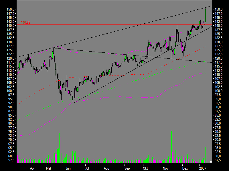 Kurs auf 200-Euro-Marke Doch auch die Charttechnik kann für die jüngsten Kurssteigerungen verantwortlich gemacht werden. Die Aktie läuft weiterhin in einem seit 2004 intakten Aufwärtstrend und hat nun eine fast parallel verlaufende, im Mai 2006 nach unten verlassene Aufwärtstrendlinie wieder überschritten (siehe Chart-Vergrößerung oben). Das kleine Kaufsignal wird etwas gedämpft durch den mittlerweile wieder angewachsenen Abstand zur gleitenden 200-Tage-Linie. Dennoch erscheinen mittelfristig wegen der schwelenden Fusionsfantasie Kurse oberhalb von 200 Euro nicht unmöglich. (15.01.07) | |