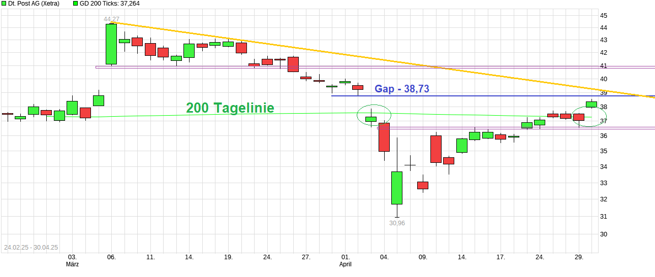 Im Xetra-Chart hat man jetzt frisch die 200 Tagelinie wieder überschritten und könnte jetzt durchaus auch noch das offene Gap bei 38,73€ schließen, wenn die Meldung über die Prognosebestätigung hinreichend gut aufgenommen würde und gleichzeitig beim Thema Zölle nichts wieder zusätzlich aufflammt.