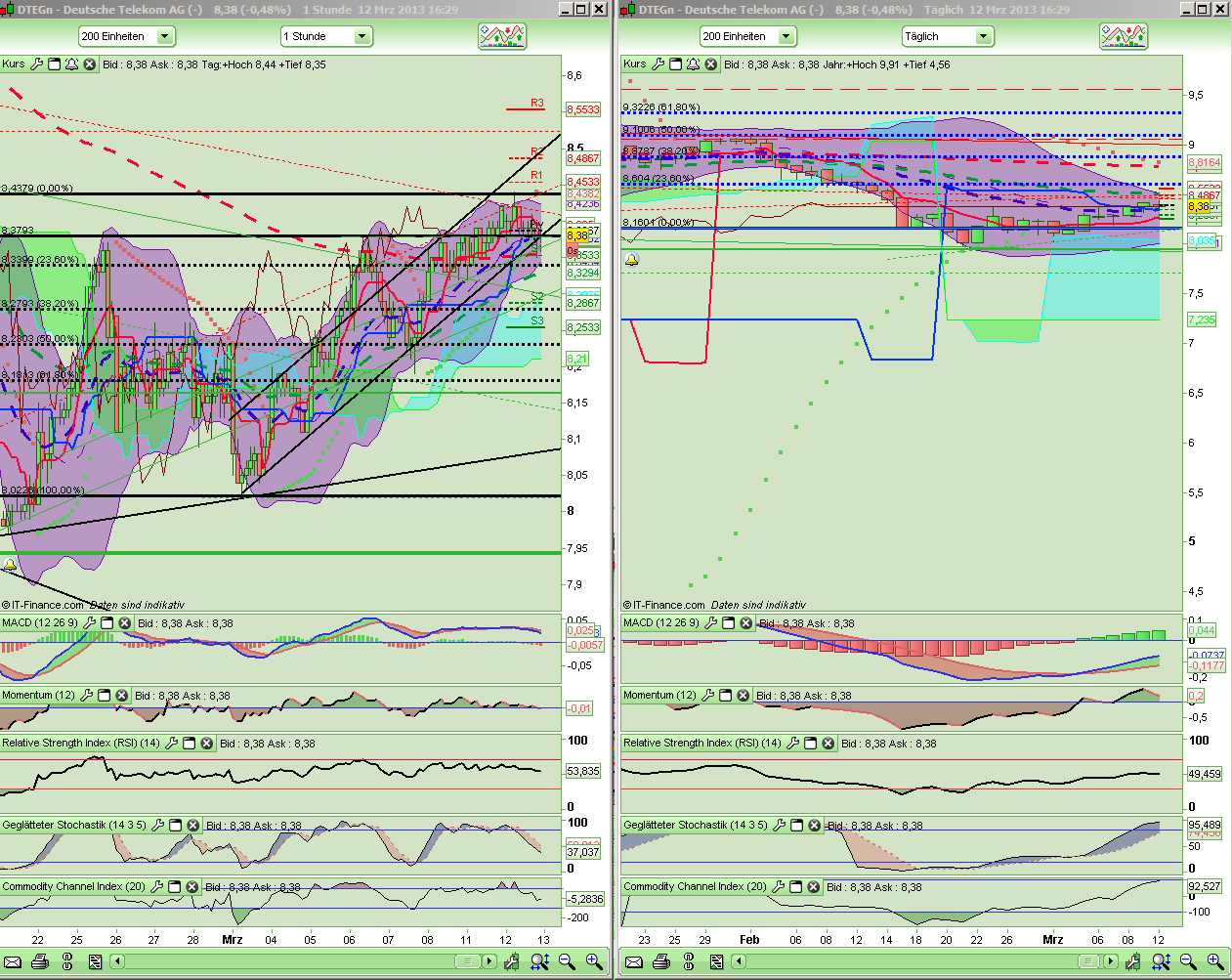 Trendkanal steigend vom 01.03. mit den Hochs vom 26.02/06.03.Die 8,48 (R2) nach oben oder die 8,23 (50er RT) nach unten wären so die nächsten Anlaufpunkte. Indikatoren eher Neutral. Sicher keine Ziele zum traden, der Einsatz einfach zu Hoch.