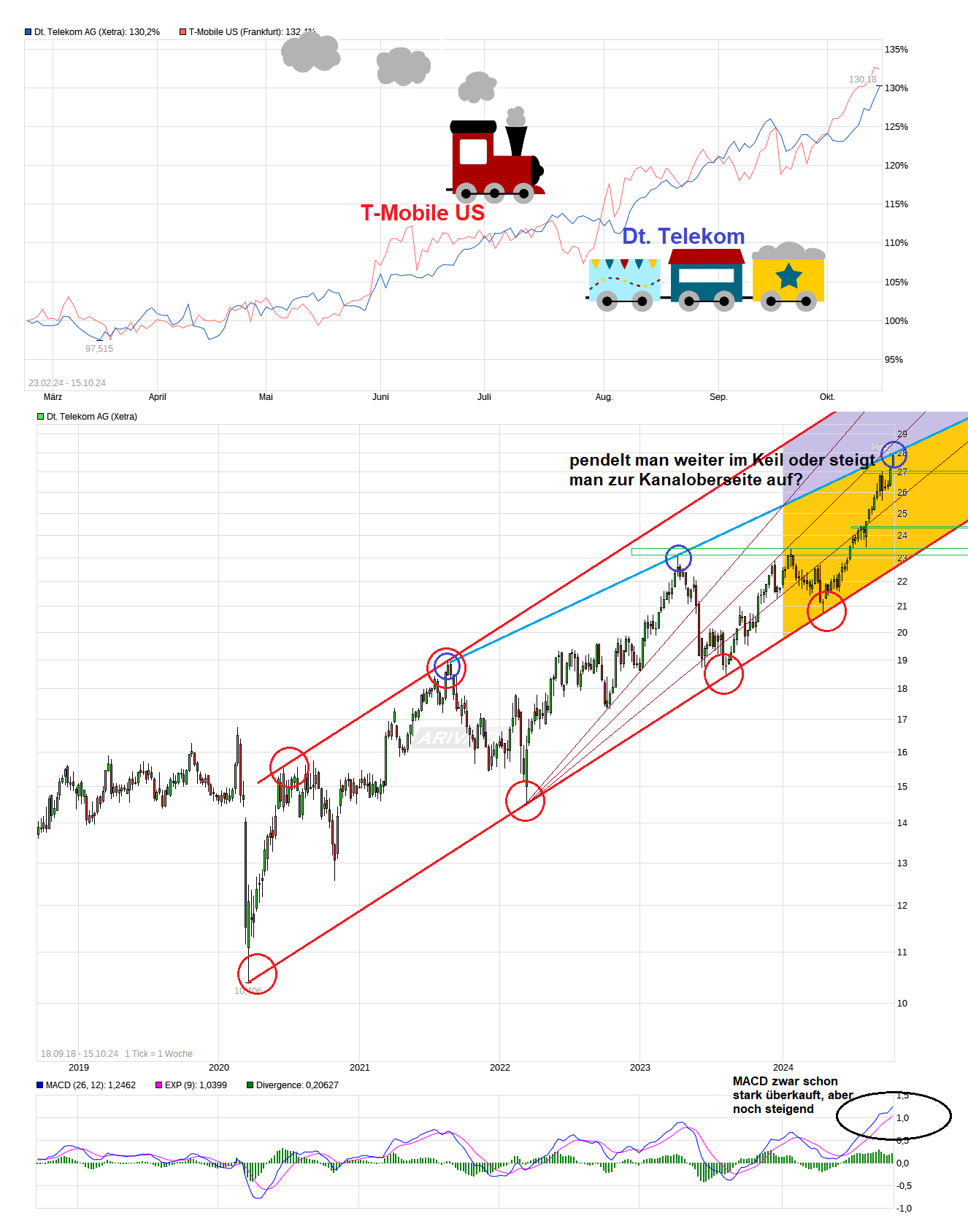 Also das kann sich doch sehen lassen. Prognose wurde nochmal etwas nach oben angepaßt. Höchster Aktienkurs seit 2001 klingt auch nicht schlecht. Allerdings dürfte man sich gerne noch etwas stärker wieder an der jüngsten Kursentwicklung von T-Mobile US orientieren. Die beiden Werte bzw. Mutter und Tochter laufen ja meistens sehr ähnlich (was angesichts der enormen MK von T-Mobile und der Bedeutung für den Gesamtwert der Mutter nicht wundert.). Würde man die Lücke der jüngsten Zeit wieder klarer aufholen, dann wäre die Dt. Telekom im Bereich von 32€. Wäre doch eine nette Kurszone für das Jahresende ;) Insgesamt kann man weiter sagen, daß die Deutsche Telekom extrem abhängig ist von der US Tochter und das restliche Geschäft zunehmend Beiwerk ist. Solange die US Tochter so schön wächst, ist das erst einmal kein Problem.