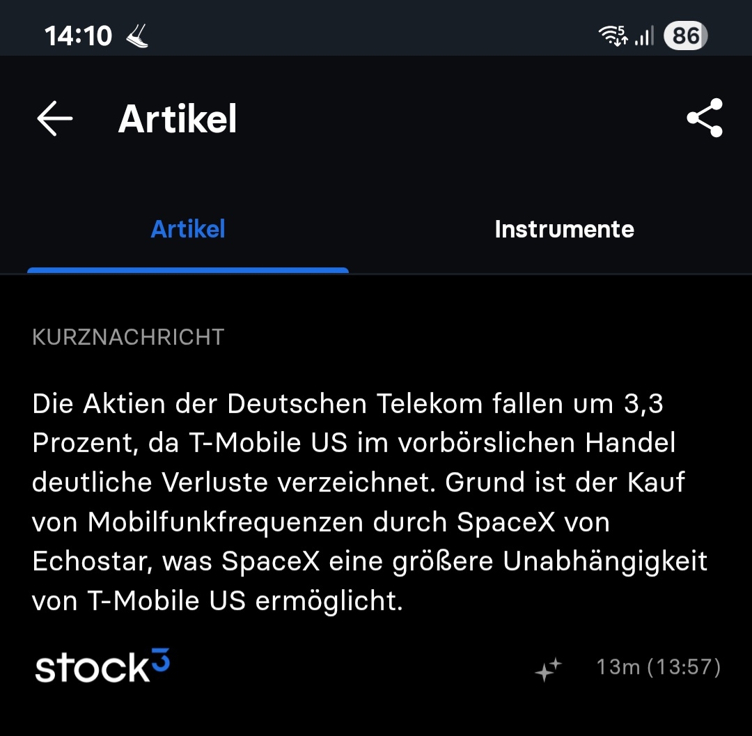 vergangene woche versichert tim den kleinanlegern, dass beim frequenz-theater von dish ( echo), die kuh vom eis ist . pustekuchen, att&t hat zumindest einen teil-zukauf vollzogen. t-mobile hat hier offensichtlich total gepennt!! die spektren von sprint wurden überschätzt und, im paket, zu teuer gekauft. die diskussion um dish und deren ungenutzten spektren, wurde auch hier im forum, schon mindestens 10-15 jahre diskutiert. auf der anderen seite wird das bei spacex schon eine gewisse umsetzungszeit benötigen um die synergien flächenmäßig umzusetzen. die 3 us mobile-provider haben künftigen umsatz eingebüßt, t- mobile wahrscheinlich am meisten. ...es sei denn, spacx bunkert die spektren wie dish. |