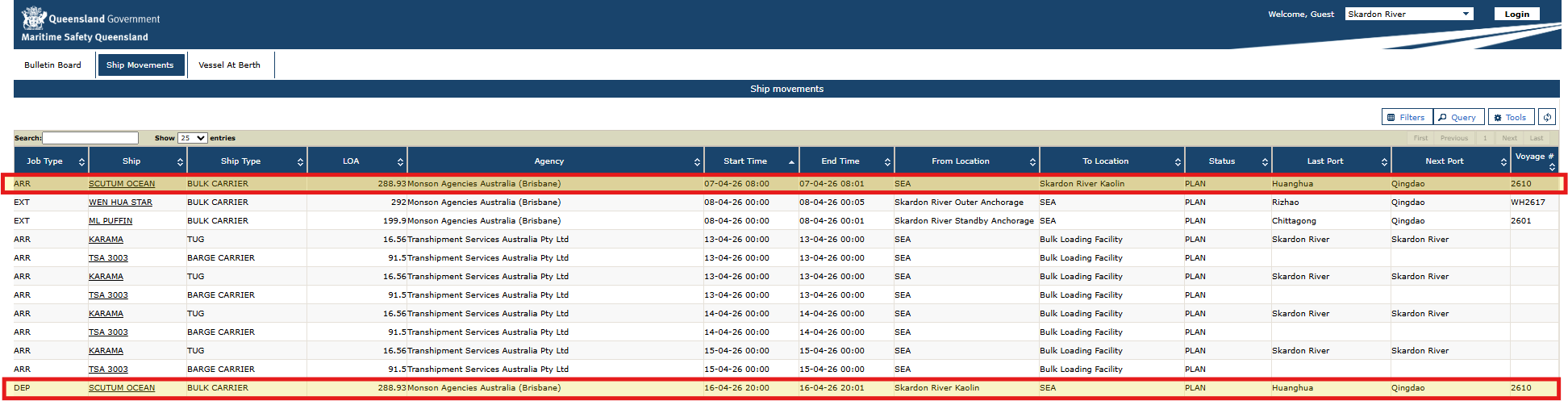 Der Staat Queensland veröffentlicht eine tägliche Übersicht der Schiffsbewegungen/Verladezustände: