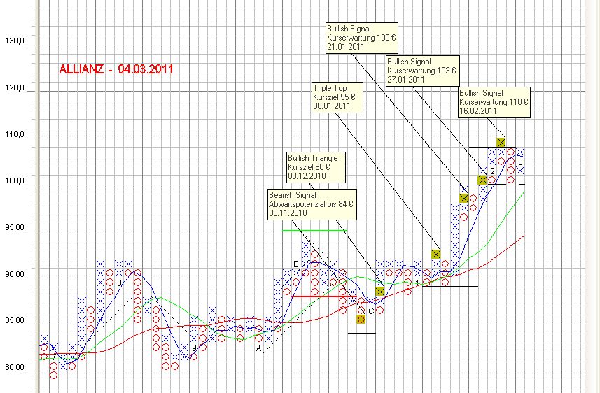 Am 24.02.2011 15:00:00 ist bei Allianz das Chartsignal neues 4-Wochen Tief aufgetreten – ein typisches short Signal. Es wurde generiert, weil der gestrige Allianz-Kurs kleiner als jeder andere Kurs in den zurückliegenden 4 Handelswochen war.