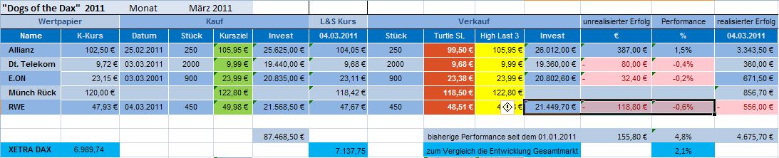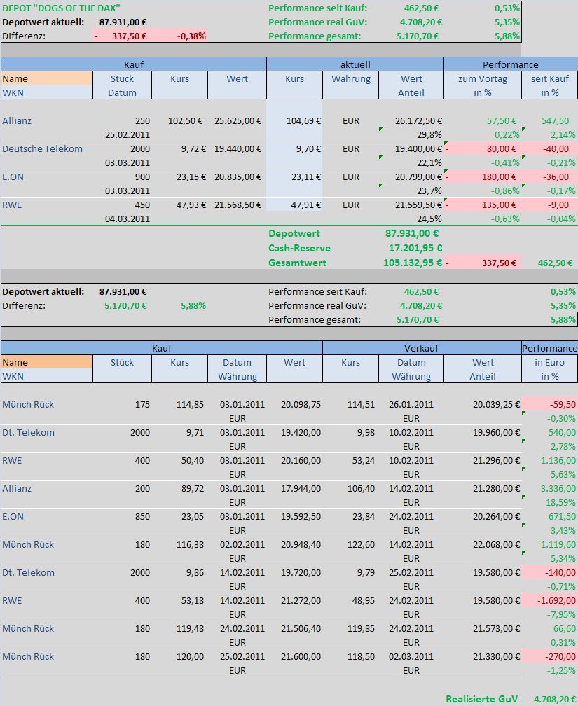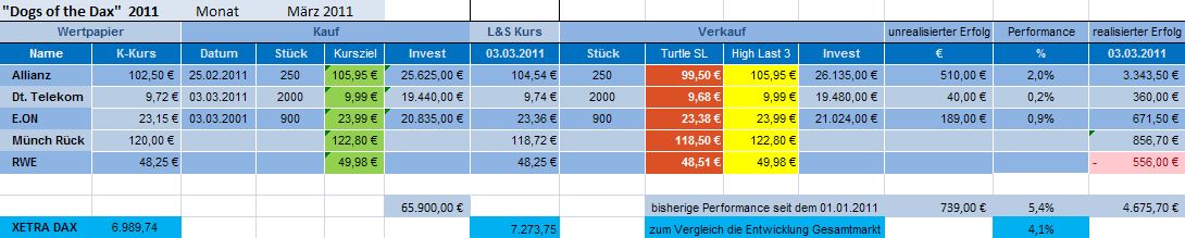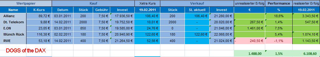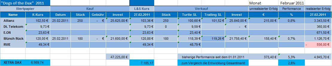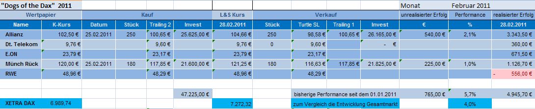 Insgesamt konnte das Depot „DOGS oft he DAX“ an der heutigen Gesamtentwicklung des DAX nochmals reüssieren. Es liegt seit dem 01.01.2011 und mit Monatsabschluss Februar 2011 mit 5,7% weiterhin über der Performance des DAX mit 4%. Damit schlägt das Depot auch im zweiten Monat den DAX.