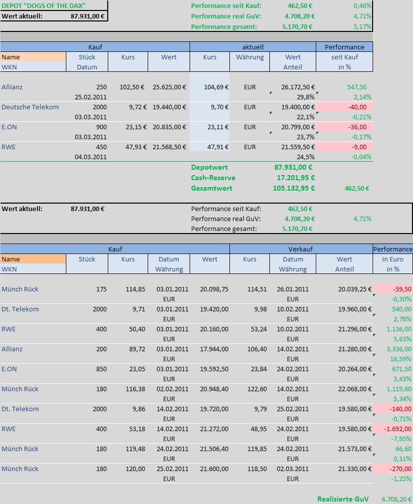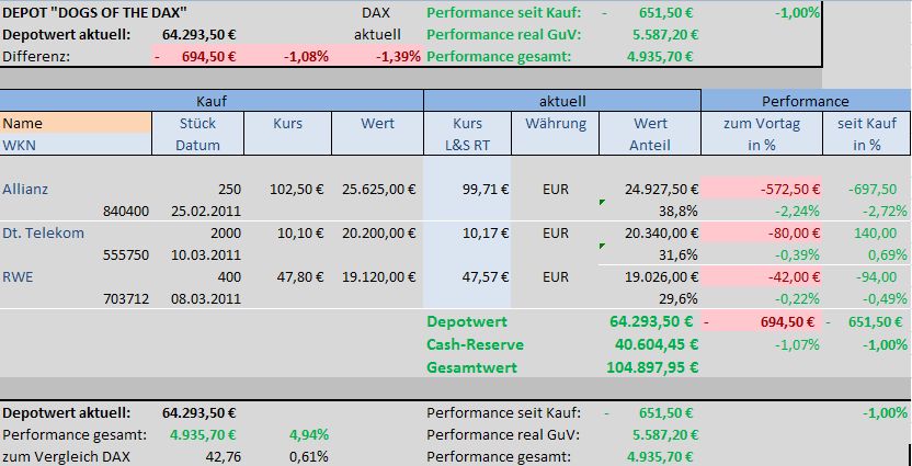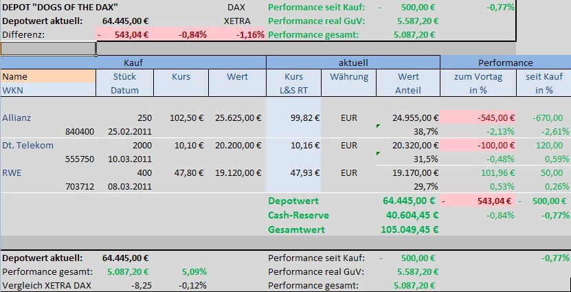 Bei den DOGS wurde teils ein so niedriges Kursniveau erreicht, dass es für den Nachkauf bzw. Wiedereinstieg von Deutsche Telekom, E.ON und RWE genutzt wurde. Insgesamt konnte das Depot mit 4,8 % auch in dieser Woche besser abschneiden als der DAX mit 2,1%.