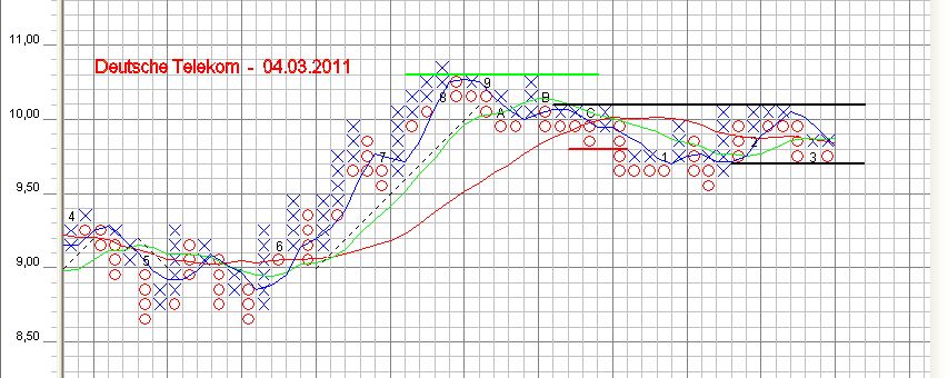 Bei diesem Wert hat sich am 09.03.2011 ein "Triple Top" ausgebildet mit einer rechnerischen Kurszielerwartung von 10,30 €. Dieses Kursziel ist schon annähernd erreicht worden, Kurs aktuell bei 10,20 €.