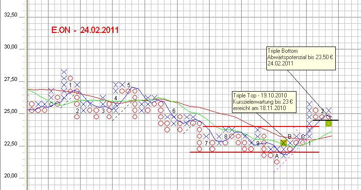 Die vorgenannten short Signale wurden von p&f charttechnischer Seite durch ein ebenfalls gestern ausgebildetes „Triple Bottom“ bestätigt.