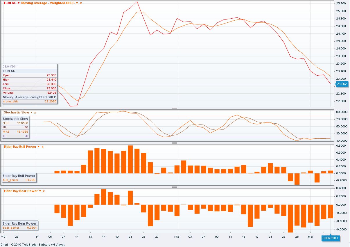 Sehr kurzfristig (auf Wochenbasis) zeigt die Aktie charttechnisch eine anhaltende Abwärtstendenz. Dennoch wurden die niedrigen Kurse der vergangenen Tage genutzt, um am 03.03.2011 bei diesem Wert wieder einzusteigen (Einstiegskurs 23,15€). Anlass dazu gaben einerseits der Slow-Stochastik, der erste Anzeichen gibt, aus der überverkauften Zone auszubrechen. Andererseits zeigen die Elder Indikatoren zunehmende bullish- bei gleichzeitig abnehmenden bearish-Tendenzen.
