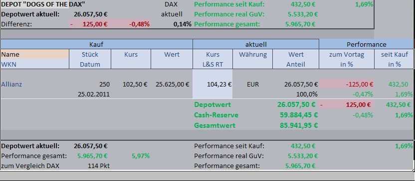 Nach dem heutigen Tag konnten alle Werte im ´Plusbereich landen. Das Depot hat nach wie vor eine bessere Performance als der DAX.