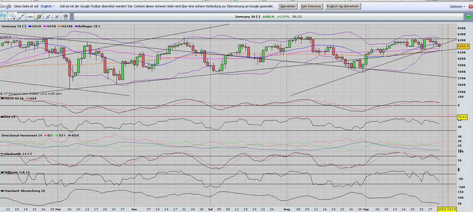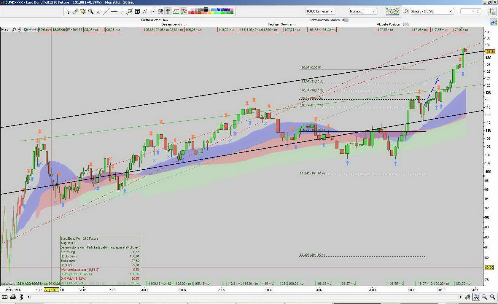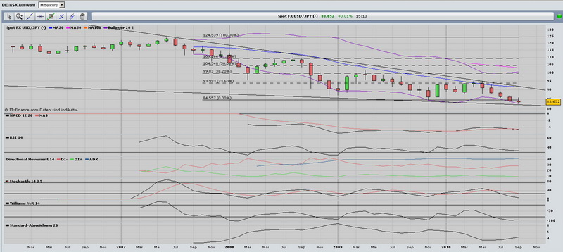 Ich bin nun schon mehr als 10 Jahre an der Börse investiert und handelte bis Anfang 2008 nur mit Aktien.Nachdem klar war das uns der Laden um die Ohren fliegen wird, shortete ich aus Frust sämtliche Werte in meinem damaligen Depot. Sozusagen aus Trotz. Letztendlich zahlte es sich für mich aus bis Ende Juli 2008. Als ich die berührung mit Optionsscheinen und Knock Out Zertifikaten verdaut hatte , ging ich mit grossen Summen ins Rennen. Von Dem Gewinn hab ich teilweise wieder bis 2009 ziemlich alles "verzockt" gehabt. Da s Gewinne waren , für die ich auch noch dem Staat Geld bezahlen hät sollen, wars mir fast egal. Seit Einführung der Quellensteuer lohnt es sich eher, zu "traden" und ich wollte nicht noch einen Analysethread aufmachen; jedoch ist es für mich hilfreich, Meine eigenen Analysen hineinzustellen, quasi zu Sammeln , um rückblickend dann zu beurteilen,ob ich richtig lag und liege oder nicht. Da letztendlich auch nur drei Wertpapiere möglich sind zuzuordnen, geht Gold leer aus. Es steht im Moment bei 1310 Tendenz up bis 1500. Meiner Meinung nach geht der Dowjones mindestens bis 11026 und müsste dort hart drehen. Der Euro /USD hat auch bald eine Wende vor sich. Packt er die 1,365 dann ist er bis knapp 1,50 steigend. Aktuell wird viel von der Japanischen Notenbank berichtet , die eingreift. Allerdings hat der USD /YEN Anstieg in erster Linie charttechnische Gründe. Weil Oft viel Unsinn geschrieben wird, wollte ich das hier auch kurz aufzeigen. Dem geneigten Leser danke ich schonmal im voraus. Meine Analysen dienen in keinem Fall dazu, danach zu handeln und ich rate schwer davor ab die Analyse des jeweiligen Wertes ernst zu nehmen und als Grundlage für das eigene Handeln herzunehmen. Dementsprechend übernehme ich auch keine Haftung für etwaige Verluste. (Das nur, weil oft und in jeder Form nach Schuldigen gesucht wird, wenn man falsch liegt)