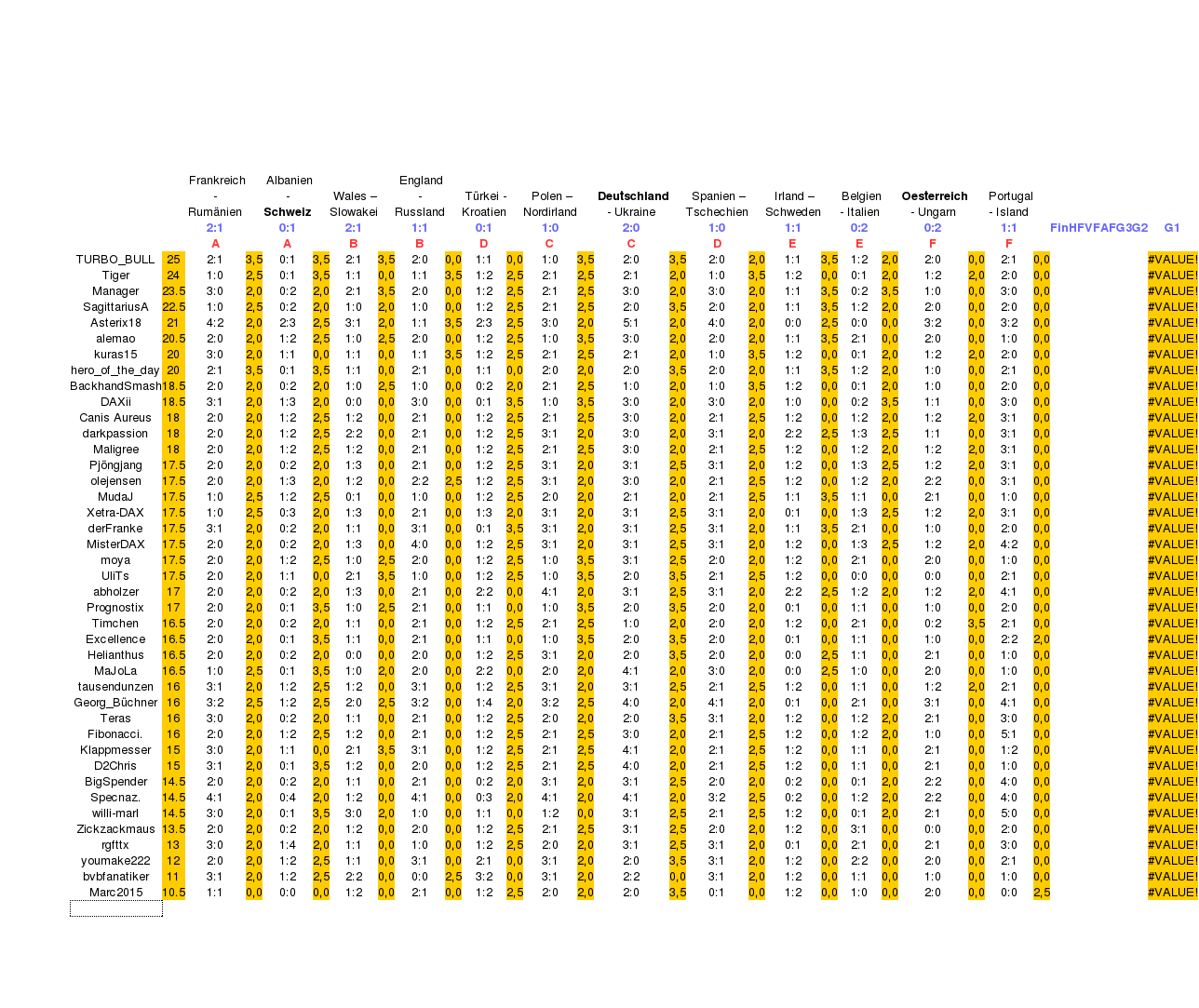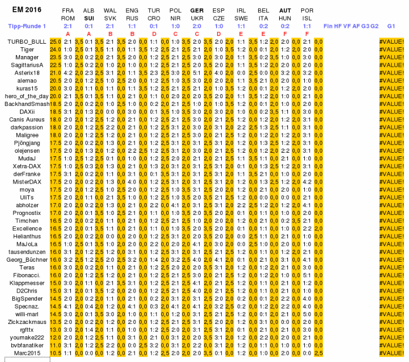 ... hier seht Ihr in chronologischer Rehenfolge Eure bislang abgegebenen Tipps für die EM 2016, Tipp-Runde 1, Gruppenphase, und zwar bis Helianthus einschließlich. - Bitte überprüft, ob Alles correct ist, und schauts bitte nach, wer noch nicht getippt hat!