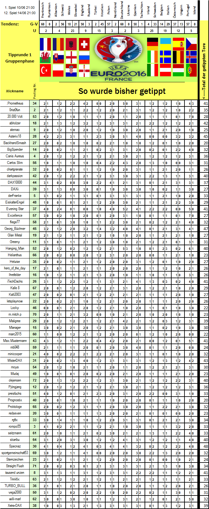 Das Team bedankt sich schonmal bei 62 abgegebenen Tipps. Neben den schon bekannten Namen auch eine erfreuliche Anzahl von Neueinsteiger. Anhand der Posting-Nr hinter den Namen der Teilnehmer darf man beruhigt selber einmal überprüfen ob denn alles korrekt wiedergegeben wurde. Wenn die Zeit es erlaubt, das kann ich hier andeuten, dann erscheint die letzte Grafik dieser Spielrunde kurz vor Beginn des Auftaktspiels Frankreich Rumänien.