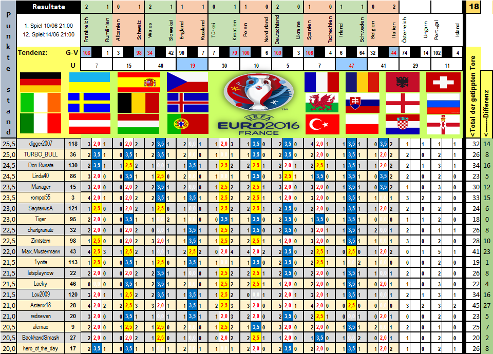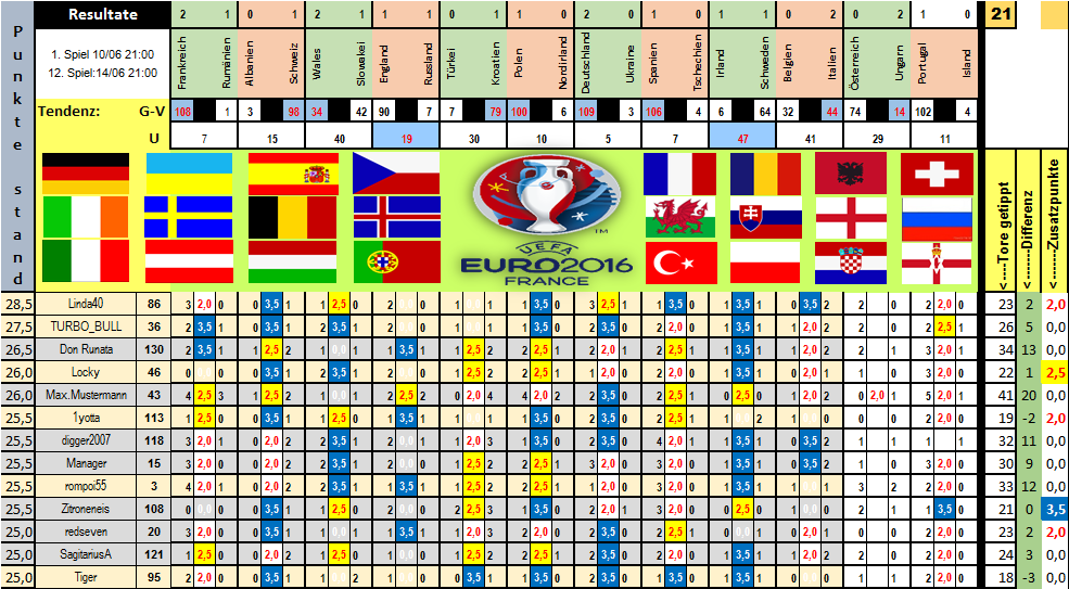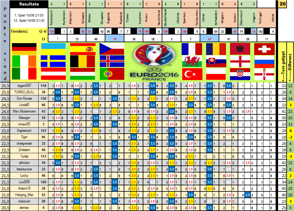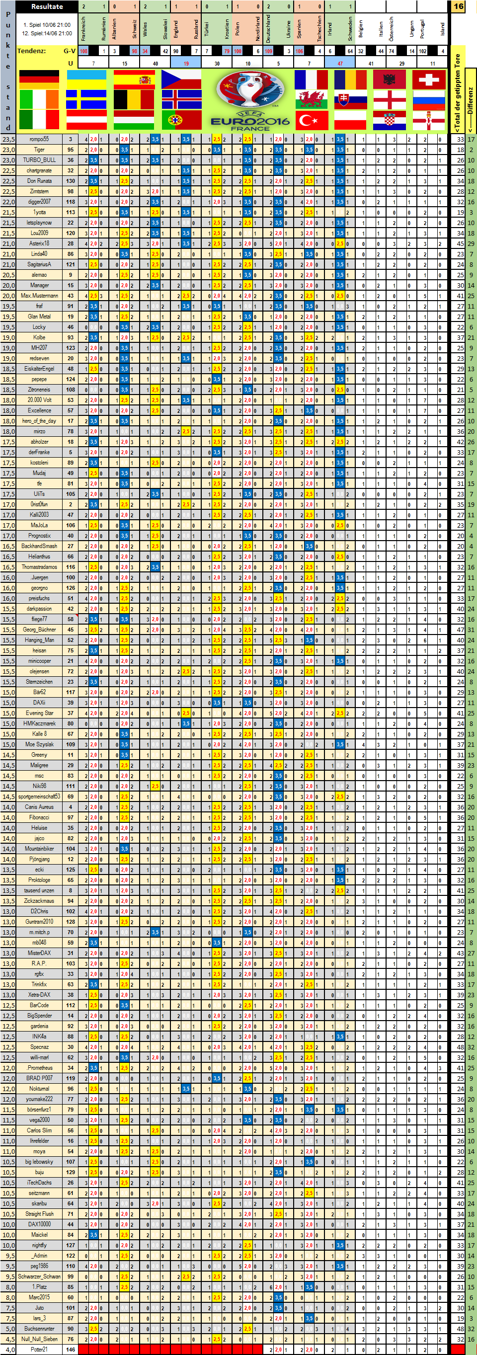 Fr 10.06. 21:00 Paris St. Denis A Frankreich - Rumänien 2:1 (0:0) Sa 11.06. 15:00 Lens A Albanien - Schweiz 0:1 (0:1) Sa 11.06. 18:00 Bordeaux B Wales - Slowakei 2:1 (1:0) Sa 11.06. 21:00 Marseille B England - Russland 1:1 (0:0) So 12.06. 15:00 Paris D Türkei - Kroatien 0:1 (0:1) So 12.06. 18:00 Nizza C Polen - Nordirland 1:0 (0:0) So 12.06. 21:00 Lille C Deutschland - Ukraine 2:0 (1:0) Mo 13.06. 15:00 Toulouse D Spanien - Tschechien 1:0 (0:0) Mo 13.06. 18:00 Paris St. Denis E Irland - Schweden 1:1 (0:0) Mo 13.06. 21:00 Lyon E Belgien - Italien 0:2 (0:1) Di 14.06. 18:00 Bordeaux F Österreich - Ungarn 0:2 (0:0) Di 14.06. 21:00 Saint-Etienne F Portugal - Island 1:1 (1:0) ----------- Nichts ist so bestaendig wie das Provisorium...Prost !! |