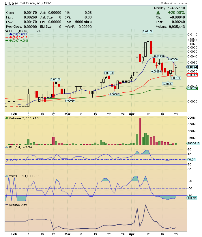 20100419 | ETLS | 10.528.291 | 25.386.615 | O 41,4% Close 0,003 20100420 | ETLS | 8.315.285 | 16.687.751 | O 49,8% Close 0,0024 20100421 | ETLS | 8.436.333 | 15.882.080 | O 53,1% Schließen 0,002 20100422 | ETLS | 2.801.467 | 5.546.617 | O 50,1% Schließen 0,0021 20100423 | ETLS | 5.377.348 | 6.171.250 | O 87,1% Schließen 0,0021