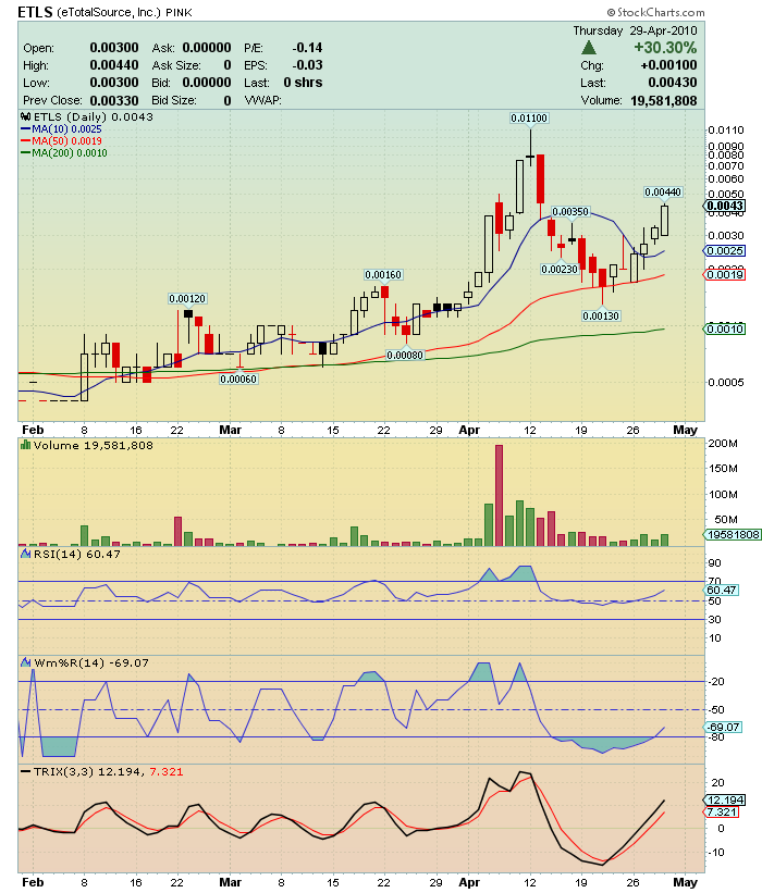 20100426 | ETLS | 6.085.950 | 9.138.413 | O 66,6% Schließen 0,0024 20100427 | ETLS | 10.852.577 | 20.791.664 | O 52,2% Schließen 0,0027 20100428 | ETLS | 5.221.412 | 9.640.458 | O 54,1% Schließen 0,0033 20100429 | ETLS | 9.082.628 | 19.392.808 | O 46,8% Close 0,0043 20100430 | ETLS | 9.240.848 | 19.414.409 | O 47,6% Close 0,0043