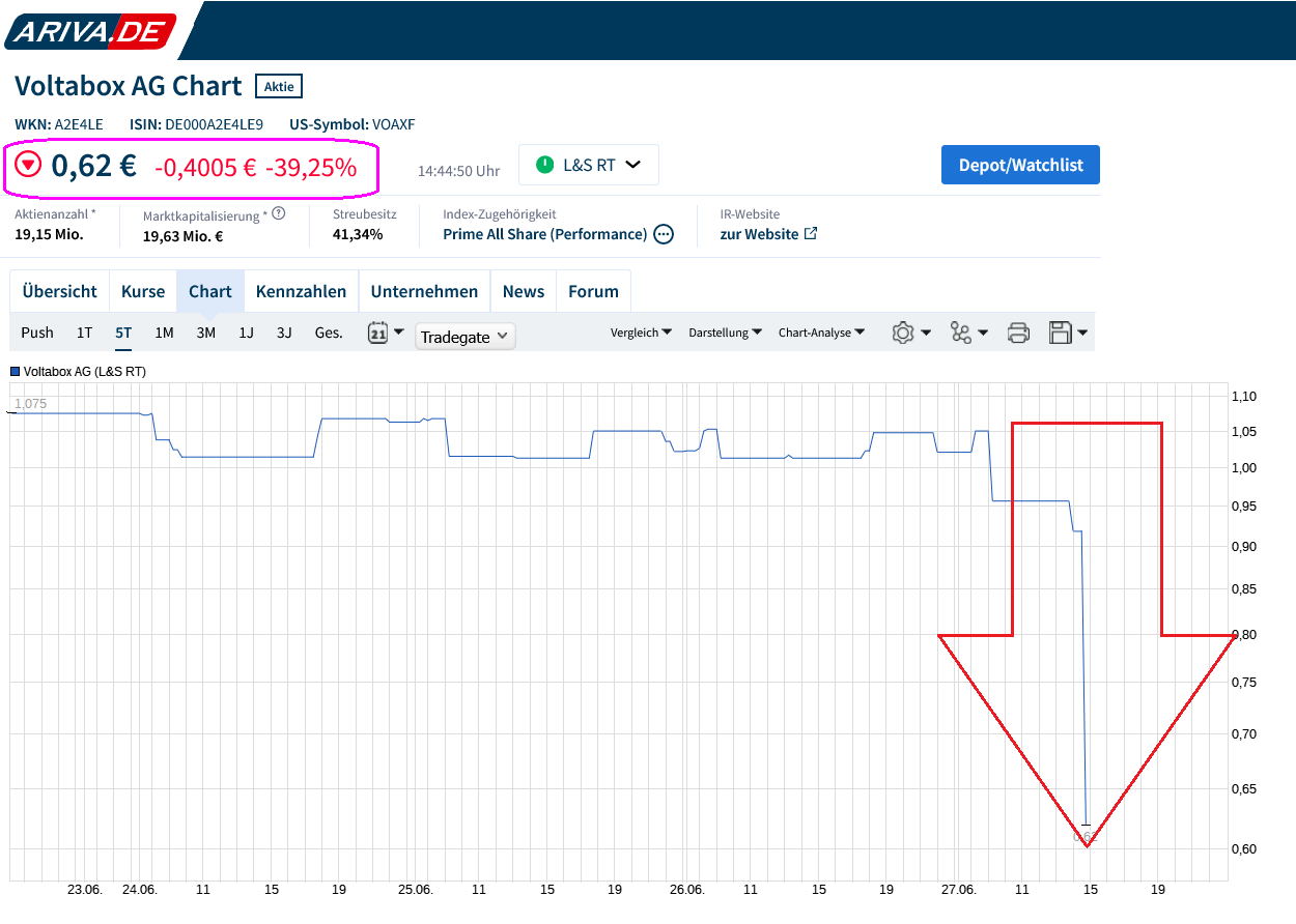 Voltabox: Gewinnwarnung - Aktienkurs bricht ein 13.08.2024 - https://www.4investors.de/nachrichten/...?sektion=stock&ID=178483 "....Voltabox produziert erneut negative Schlagzeilen - am Dienstag kommt eine Gewinnwarnung des Unternehmens aus Paderborn, als „Prognose für das Geschäftsjahr 2024 angepasst“ betitelt. Man erwarte einen Umsatz von 6 Millionen Euro und „nunmehr ein EBITDA von etwa -50 %“, wie Voltabox meldet. Im Laufe des Tages wolle man noch den Halbjahresbericht vorlegen. Hintergrund ist vor allem die Restrukturierung der Voltabox-Tochtergesellschaft GreenCluster GmbH. „Angesichts der aktuellen marktseitigen Herausforderungen hat das Unternehmen seine Handelsaktivitäten vorübergehend zurückgefahren.... Zudem gibt es im Bereich der Hochvolt-Batteriesysteme negative News: Man habe nach der Insolvenz eines Endkunden die Lieferungen gestoppt, so Voltabox. Man erwarte nun einen Umsatzausfall in diesem Geschäft, kündigt die Gesellschaft an..."Die Voltabox Aktie notiert im Tradegate-Handel bei 0,90 Euro mit 34,55 Prozent im Minus..."