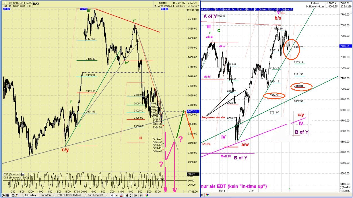 -------------------------------------------------- Rückblick : Update DAX Tagesausblick 12.05.2011 10:00 Um annähernd ableiten zu können, wie sich der Verlauf im DAX weiter entwickelt, werfen wir einen Blick auf den gestrigen Verlauf im DOW : Die Abwärtswelle ab 12781 hat ihre 0-ii Linie gebrochen und der Verlauf bis oder ab 15:30 wird eine Welle v dieser ersten? Abwärtswelle darstellen können. Die langsame Welle ab 12599/12621 auf 12781 ist meines Erachtens kein EDT sondern eine b/x Welle. Somit ist die noch ausstehende 'grüne Welle c' auf 127xx nicht die unwahrscheinlichste Variante. Maßgebend für den weiteren Verlauf dürfte auch die vorhandene? Unterstützung am mittleren TagesBollingerband (mid d BB) sein. Tja, was wird der DAX so lange machen ? Als Spielball des DOW Future kann er nur rumhopsen und bei 20 Minuspunkten im DOW Future in Angstschweiß ausbrechen. Somit dürfte sich der DAX eher seitwärts bewegen in Richtung der zahlreichen Abwärtstrendlinien. -------------------------------------------------- Einschließlich Angstschweiß im DAX und Erholung Richtung Trendlinien auf die vordefinierten Zwischenwellen iv' ....v'' usw. paßte ALLES. Die "grüne Welle c" im DOW bewegt sich noch oberhalb der 0-ii/b Linie, ist also noch nicht fertig ! Der Vortrieb ist bei 12700 ins Stocken gekommen und so wie es im Chart ausssieht, könnte der DOW zum Handelsstart schon ein paar Punkte abgeben. Obwohl ich den pinkfarbenen Verlauf (Rückfall auf/unter 12550) favorisiere, werde ich die möglichen Grenzwerte nach oben abstecken : VARIANTE A (momentan favorisiert) Der DOW läuft in einer ii/b aufwärts, um dann in einer iii/c wieder auf 12550-1239x zu fallen. Die ii darf höchstens auf 12875 ;-) aber schon Kurse über 12750/12800 ließen sie immer unwahrscheinlicher werden. Die b muß über die AWT (vom Topp 12875 über 12781 gezogen) damit man eine 0-b Linie ziehen kann. Vorzugsweise beendet der DOW aber seinen Höhenflug in der Region 12700 und fällt bis 12650-zurück, um dann einen erneuten und letzten Anlauf auf die 12750+ zu vollziehen oder direkt die 12550-1239x anzusteuern. VARIANTE B Der Vollmond schlägt zu und der DOW überrennt die 13.000er Marke. Die ab 12537 gestartete Welle ist erst Teil 1 (also Welle i) und nach einer Zwischenkorrektur folgt die iii ....... Anhand der noch ungebrochenen 0-ii/b Linie läßt sich diese Variante ganz gut verfolgen. Wird die Linie gebrochen, ist die Korrektur zu beobachten. Sie könnte schon Aufschluß über die Folgewelle geben. Steigt der DOW noch oberhalb der der 0-ii/b Linie (grüne AUT rechts im Chart) über 12800+, könnte sich diese Variante durchsetzen. Einen Attraktor stellt das GAP bei 12750 dar. Heute kommt dem DOW Future also eine besondere Bedeutung zu. Daß wir Freitag den 13. schreiben, dürfte eher keine Rolle spielen. Viel Erfolg ! |