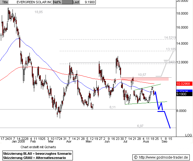 Kurz-Kommentierung: Die Evergreen Solar Aktie befindet sich in einer mehrmonatigen, bärisch anmutenden Seitwärtsbewegung oberhalb von 8,11 $. In unserer letzten Analyse vom 15.07.2008 wiesen wir nach einem Kurssprung auf eine Shortchance im Bereich bei 10,29 - 10,57 $ hin. Die Aktie pralllte erwartungsgemäß nach unten hin ab und pendelte in den vergangenen Wochen weiter seitwärts auf tiefem Niveau.