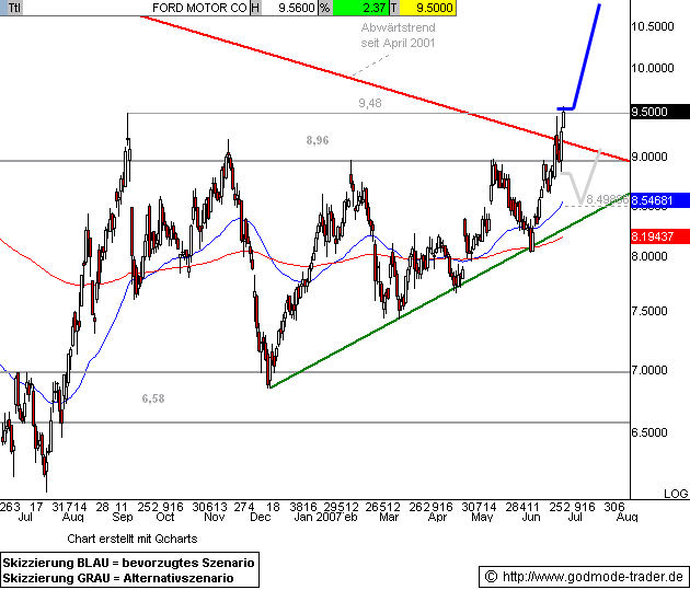 Kurz-Kommentierung: Die FORD Aktie startete vergangene Woche den erwarteten Kursausbruch nach oben (s. letzte Basisanalyse - hier klicken), nach den sie in den vergangenen Monaten mehrfach gegen die 8,96 $ Marke drückte. Die steigende Volatilität und Kursdynamik der letzten Tage könnten jetzt eine steile Rallye auslösen. Steigt sie jetzt per Tages- und Wochenschluss über das Hoch aus 2006 bei 9,48 $ an, steht direkten Kursgewinnen bis 11,50 und 12,75 und darüber mittelfristig 17,33 $ nichts mehr im Wege. Fällt sie hingegen wider Erwarten per Tages- und Wochenschluss unter 8,85 $ zurück, wird das Kaufsignal wieder neutralisiert und eine Abwärtskorrektur bis ca. 8,60 und ggf. 8,50 $ wahrscheinlich.