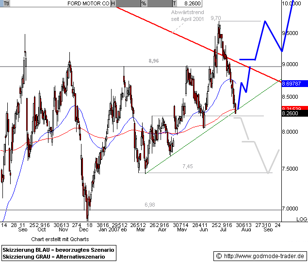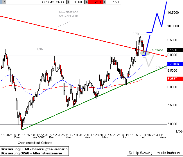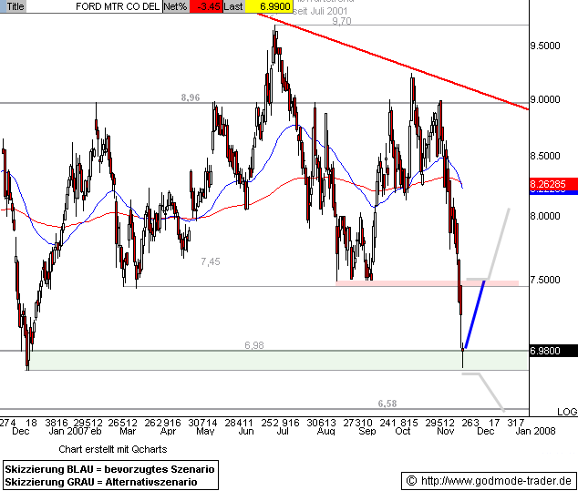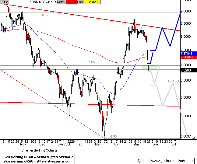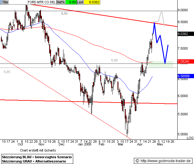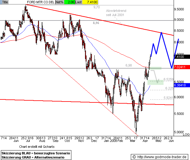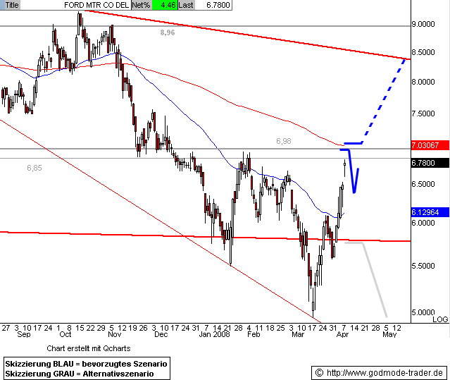 Kurz-Kommentierung: Die FORD Aktie konnte die im März am Jahrestief bei 4,95 $ gestartete Kurserholung wie angekündigt weiter fortsetzen und nähert sich heute dem Zwischenziel bei 6,85 - 6,98 $ (vgl. angehängte Chartgrafik. Bei erreichen dieses Widerstandsbereichs wäre mit einer Zwischenkorrektur zu rechnen.